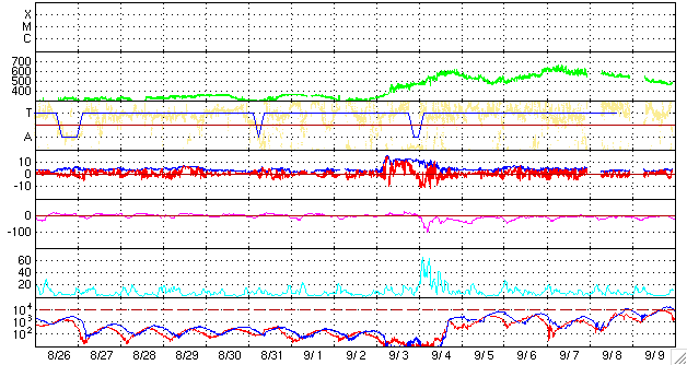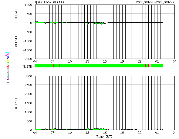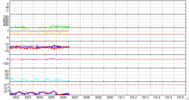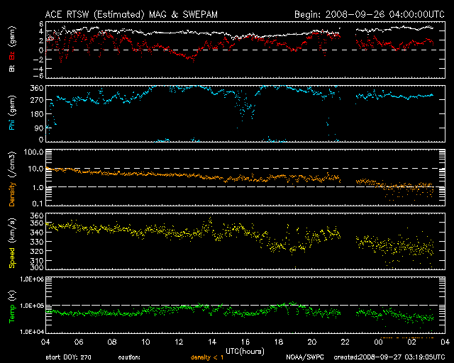 2008/ 9/27 12:19 更新 低速の太陽風が続き、磁気圏も静穏です。コロナホールが太陽の中心に近づいています。 担当 篠原 低速の太陽風が続いています。 速度は、昨日からほとんど変わらず、330〜340km/秒で安定しています。 磁場強度も、4nTと通常の強さのままです。 太陽風が穏やかなので、磁気圏活動もとても穏やかです。 昨日のAE指数には、変化が全く見られませんでした。 SOHO EIT195の太陽コロナを見ると、 コロナホールの先頭(右端)が、いよいよ太陽の中心に達しつつあります。 ここに来ると、3〜4日程度で高速太陽風が始まります。 9月30日か、10月1日ころになりそうですが、 これは、27日周期の図で、前周期の9月3-4日に乱れが始まっていたこととよく合います。 太陽は無黒点で、静かです。 SOHO EIT195では、東端(左端)に明るい点が見えています。 更に発達して、黒点が現れる可能性があります。 SOHO EIT195による、太陽コロナの様子。27日11時(世界時27日2時)。 (c) SOHO (ESA & NASA) ![]() ACEが観測した太陽風の磁場(1番上の枠、白線は全体の強度、赤線は南北成分) および、太陽風の密度(3番目の橙線)、速度(4番目の黄線) (c) NOAA/SWPC ![]() リアルタイムAE指数 下段のAEグラフの値が高くなると、オーロラ活動が活発化しています。 (c) 京都大学, NICT ![]() シベリアで観測された3日間の磁場データ 右側の3分の1が、昨日のデータになります。グラフが上がったり下がったりすると、オーロラ活動が活発化しています。 (c) NICT ![]() 27日の太陽周期に合わせたデータプロット 太陽が同じ面を地球に向けていた27日前の変化から、今後を予想することができます。 (c) NICT
