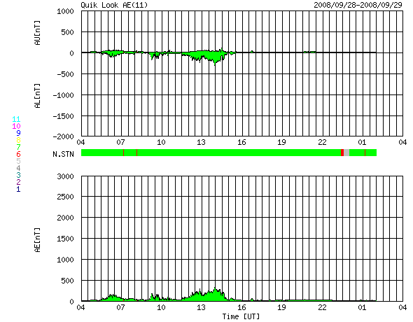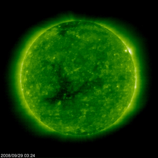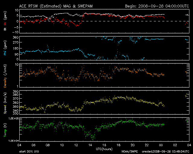 2008/ 9/29 12:49 更新 低速で穏やかな太陽風が続いています。明日以降、高速太陽風が始まるでしょう。 担当 篠原 太陽風は、350km/秒前後の低速状態が続いています。 磁場強度も5nT付近にあり、現在はまだ穏やかです。 地球の磁気圏も概ね静穏です。 南向き磁場の影響で、250nTくらいの小規模活動がAE指数に見られていますが、 一時的な変動です。 今日いっぱいは、このまま穏やかに推移して行くでしょう。 そして、明日以降、高速太陽風が始まります。 SOHO EIT195では、コロナホールは太陽の中心線を過ぎ、西側に移動しています。 先頭(右端)が、西半球(右半分)のまん中に達する頃が、 高速風が始まるタイミングの目安です。 今日のSOHOの写真では、もう一息というところです。 27日周期の図で、前回の変化を見ると、 高速風はゆっくりと立ち上がり、600km/秒まで上昇しています。 高速風は、7日程度続きました。 今回も同程度の高速風になりそうです。 高速風が始まるとともに、オーロラ活動が活発化し、 放射線帯の高エネルギー電子も強まります。 明日以降は、それぞれのデータに注意してください。 太陽風の乱れは、10月6-7日くらいまで続くでしょう。 太陽はとても静穏です。 黒点は見られません。 SOHO EIT195による、太陽コロナの様子。29日12時半(世界時29日3時半)。 (c) SOHO (ESA & NASA) ![]() ACEが観測した太陽風の磁場(1番上の枠、白線は全体の強度、赤線は南北成分) および、太陽風の密度(3番目の橙線)、速度(4番目の黄線) (c) NOAA/SWPC ![]() リアルタイムAE指数 下段のAEグラフの値が高くなると、オーロラ活動が活発化しています。 (c) 京都大学, NICT ![]() シベリアで観測された3日間の磁場データ 右側の3分の1が、昨日のデータになります。グラフが上がったり下がったりすると、オーロラ活動が活発化しています。 (c) NICT ![]() 27日の太陽周期に合わせたデータプロット 太陽が同じ面を地球に向けていた27日前の変化から、今後を予想することができます。 (c) NICT