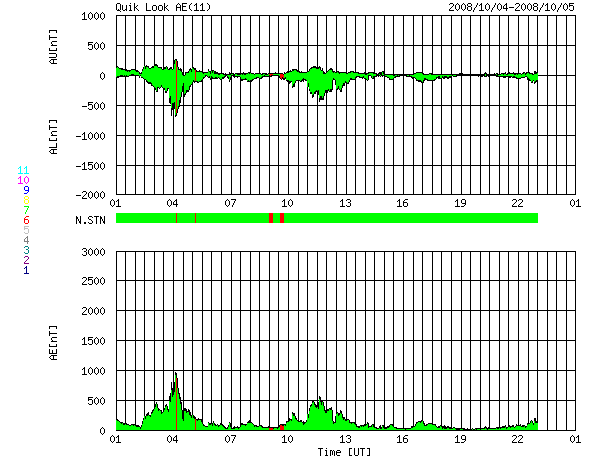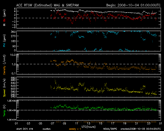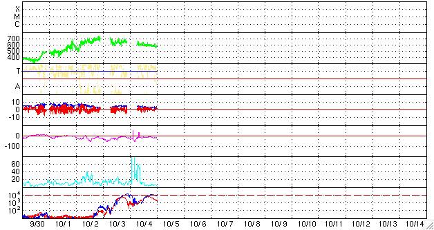 2008/10/ 5 09:54 更新 太陽に1003黒点群が出現しました。高速風は終わりに近づき、ゆっくりと速度を下げています。 担当 篠原 太陽に新しい黒点が出現しました。 NOAAでは1003番と番号を付けています。 非常に小さい黒点です。 1枚目のSOHO可視光写真の南東(左下)付近を、じっと見て、探してみてください。 2枚目のSOHO磁場写真を見ると、 黒点付近は磁場が強まっていますので、場所がよく分かります。 今回の黒点は、南半球の低緯度(南緯23度)側に出現しています。 磁場の極性の白(N極)と黒(S極)は、 どちらかというと、南北(上下)に分布しています。 あえて東西方向を読み取ると、[ 白 黒 ]の順番でしょうか。 [ 白 黒 ]の並びは、南半球ではこれまでの活動周期、第23期の性質です (新しい24期は、[ 黒 白 ]の順番です)。 このくらいの緯度だと、新しい24活動周期の性質が見えてもよさそうなのですが、 太陽も微妙な変化をしている時期なのでしょうか。 3枚目の写真は、SOHO EIT195の太陽コロナです。 黒点が出現した領域は、明るく光っています。 この後、発達するのか、消えて行くのか、注目してください。 いずれにせよ、 ここへ来て黒点の出現頻度が高まってきたことは、間違いなさそうです。 太陽風は、高速状態が続いています。 しかし、速度はゆっくりと低下を始め、560km/秒へ下がっています。 磁場強度も3nTに弱まり、高速風は終わりに向かっています。 速度が600km/秒台を保っていたこともあり、 昨日も磁気圏活動はやや活動的でした。 AE指数で、900nTと500nTのまとまったオーロラ活動が発生しています。 速度と磁場強度が弱まって来たことから、 今日以降は、磁気圏も穏やかになってくるでしょう。 明日か明後日くらいで、速度も通常のレベル(400km/秒付近)に戻って行くと思われます。 放射線帯高エネルギー電子は、 青線のGOES-11が、ぎりぎりで警戒レベルの10,000を保っています。 高速風が終わりつつあることから、今後はゆっくりと減少に向かうと思われます。 もうしばらく、高い状態が続きますので、注意が必要です。 太陽の南東(左下)に黒点群が出現しました。SOHO衛星。5日1時(世界時4日16時)。 (c) SOHO (ESA & NASA) ![]() SOHO衛星による太陽の磁場分布。黒点の場所の磁場が強まっています。5日1時(世界時4日16時)。 (c) SOHO (ESA & NASA) ![]() SOHO EIT195による、太陽コロナの様子。5日9時半(世界時5日0時半)。 (c) SOHO (ESA & NASA) ![]() ACEが観測した太陽風の磁場(1番上の枠、白線は全体の強度、赤線は南北成分) および、太陽風の密度(3番目の橙線)、速度(4番目の黄線) (c) NOAA/SWPC ![]() リアルタイムAE指数 下段のAEグラフの値が高くなると、オーロラ活動が活発化しています。 (c) 京都大学, NICT ![]() シベリアで観測された3日間の磁場データ 右側の3分の1が、昨日のデータになります。グラフが上がったり下がったりすると、オーロラ活動が活発化しています。 (c) NICT ![]() 27日の太陽周期に合わせたデータプロット 太陽が同じ面を地球に向けていた27日前の変化から、今後を予想することができます。 (c) NICT
