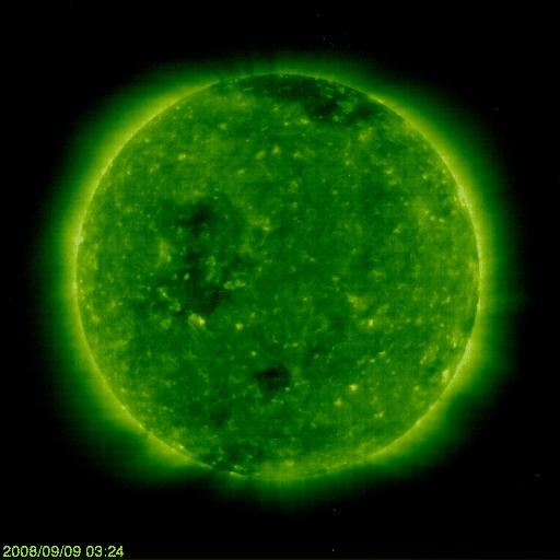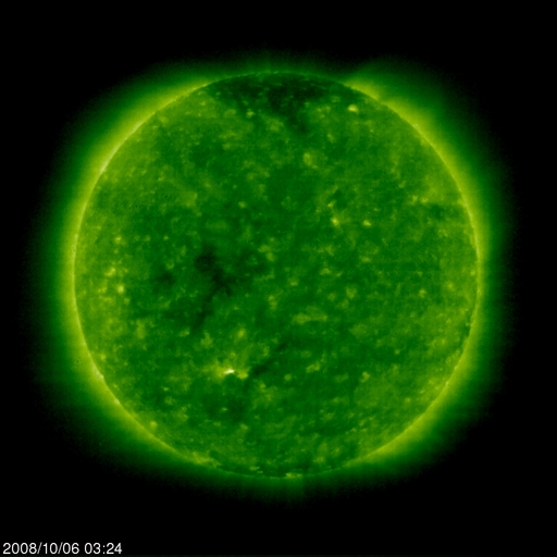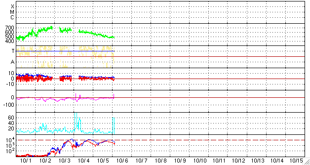 2008/10/ 6 12:49 更新 高速太陽風は終わりに向かっています(480km/秒)。黒点群は消えて、太陽は無黒点です。 担当 篠原 昨日現れた1003黒点群は、すぐに消えてしまいました。 太陽は無黒点にもどり、静穏です。 まだ、安定した規模の黒点群にはなりませんでした。 高速太陽風は、ゆっくりと速度を下げつつも、高速状態を保っています。 昨夜、500km/秒台を割り、現在は480km/秒ほどです。 この後も、高速風は次第に速度を下げ、 今日、明日くらいで、通常の速度に戻るでしょう。 高速風が弱まるとともに、磁気圏へ流れ込むエネルギーも小さくなっています。 AE指数は、小さな変化が見えている程度で、磁気圏は概ね静穏です。 3日幅のシベリア磁場データを見ると、3日前は活発だったオーロラ活動が、 一昨日、昨日と次第に静穏になっていく様子がよく分かります。 高速風はやがて終わり、 磁気圏も、これから6日間程度は穏やかな状態が続くでしょう。 SOHO EIT195で、次のコロナホールが太陽の中心に近づいています。 現在の太陽と27日前の太陽で、コロナホールの広がりを比べてみましょう。 1枚目の写真は、現在の太陽コロナです。 2枚目の写真は、太陽が同じ面を地球に向けていた、27日前の太陽です。 どちらにも、太陽の中心やや東(左)にコロナホールの薄暗い影が見えています。 しかし、27日前は比較的まとまって濃い部分が見えていたのに対し、 現在の太陽では、暗い部分が小さくなっています。 コロナホールの規模が縮小しているのかもしれません。 27日周期の図で、前周期の太陽風を振り返ると、 9月15日に始まった高速太陽風は、継続時間が2日間程度と規模の小さなものでした。 今回、この高速風領域の規模がさらに小さくなっている可能性があります。 回帰は、10月12日頃だと予想されますが、どうなるでしょうか。 放射線帯高エネルギー電子は、ほとんど変化がありません。 高速風が終わりに近づき、これから、ゆっくりとした減少が始まります。 SOHO EIT195による、太陽コロナの様子。6日12時半(世界時6日3時半)。 (c) SOHO (ESA & NASA) ![]() SOHO EIT195による、27日前の太陽コロナ。9月9日12時半(世界時9月9日3時半)。 (c) SOHO (ESA & NASA) ![]() SOHO衛星のMDIカメラによる太陽黒点 (c) SOHO (ESA & NASA) ![]() GOES衛星の太陽X線データ (c) NOAA/SWPC ![]() ACEが観測した太陽風の磁場(1番上の枠、白線は全体の強度、赤線は南北成分) および、太陽風の密度(3番目の橙線)、速度(4番目の黄線) (c) NOAA/SWPC ![]() リアルタイムAE指数 下段のAEグラフの値が高くなると、オーロラ活動が活発化しています。 (c) 京都大学, NICT ![]() シベリアで観測された3日間の磁場データ 右側の3分の1が、昨日のデータになります。グラフが上がったり下がったりすると、オーロラ活動が活発化しています。 (c) NICT ![]() 27日の太陽周期に合わせたデータプロット 太陽が同じ面を地球に向けていた27日前の変化から、今後を予想することができます。 (c) NICT
