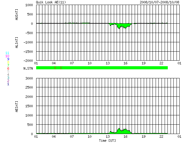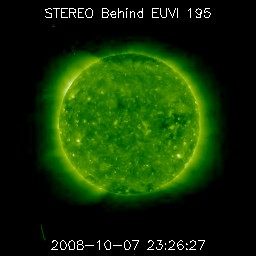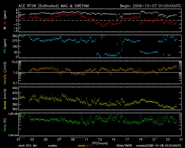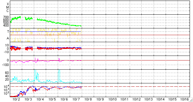 2008/10/ 8 09:20 更新 400km/秒の速度で太陽風は安定しています。3日ほど静穏な状態が続くでしょう。 担当 篠原 地球は高速風領域を抜け出し、 昨日の太陽風は、400km/秒と平均的な速度で安定していました。 磁場強度も3〜4nTとやや弱めの値で安定し、穏やかな太陽風となっています。 これを受け、地球の磁気圏も穏やかな状態で安定しています。 オーロラの活動度を示す、AE指数の変化を見ると、 一カ所だけ、250nTほどの小規模活動が見られますが、その他は全く平坦です。 オーロラ活動が発生した時間帯は、ACEの太陽風を見ると、 磁場の南北成分が、4時間ほど-2nTほどの南を向き続けていました。 この影響で、オーロラが発生したのでしょう。 ただし、速度は下がっていますから、磁気圏への影響も限定的でした。 太陽風は、明後日くらいまでは穏やかに過ぎ、 11日、あるいは12日頃に、高速風がやってくるでしょう。 今度の高速風は規模が小さく、2日ほどで終わりそうです。 今日は、SOHOの写真が更新されていません。 その代わりに、STEREO Behindの太陽コロナ写真を掲載します。 STEREO Behindは、地球よりも3日分近く自転が進んだ太陽を見ています。 そのため、SOHOでは太陽の中心に見えていたコロナホールは、 既に、西側(右側)に大きく移動しています。 一方、太陽の東半球(左側)を見ると、新たなコロナホールなどは見られず、 今度のコロナホール以降の擾乱要因は見られません。 放射線帯高エネルギー電子は、若干減少していますが、 まだ高めの状態が続いています。 減少のペースはとてもゆっくりです。 太陽は、最新写真が見られないのですが、無黒点のままの様です。 X線の変化は非常に静穏です。 STEREO衛星が撮影した、太陽コロナの写真。8日8時半(世界時7日23時半)。 (c) NASA ![]() ACEが観測した太陽風の磁場(1番上の枠、白線は全体の強度、赤線は南北成分) および、太陽風の密度(3番目の橙線)、速度(4番目の黄線) (c) NOAA/SWPC ![]() リアルタイムAE指数 下段のAEグラフの値が高くなると、オーロラ活動が活発化しています。 (c) 京都大学, NICT ![]() シベリアで観測された3日間の磁場データ 右側の3分の1が、昨日のデータになります。グラフが上がったり下がったりすると、オーロラ活動が活発化しています。 (c) NICT ![]() 27日の太陽周期に合わせたデータプロット 太陽が同じ面を地球に向けていた27日前の変化から、今後を予想することができます。 (c) NICT