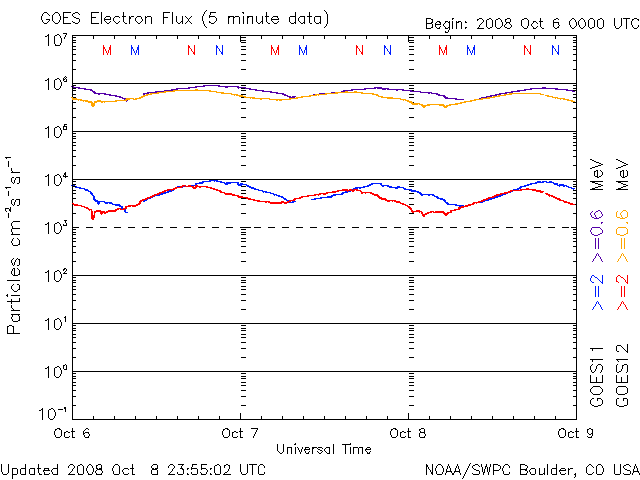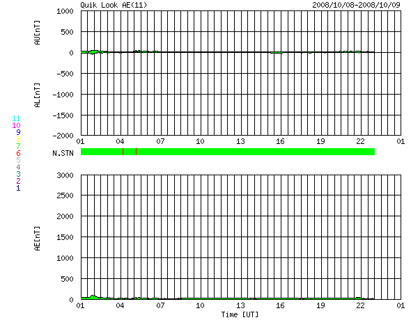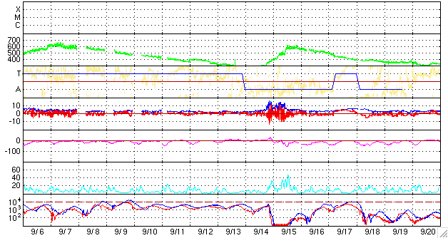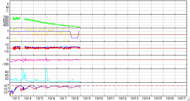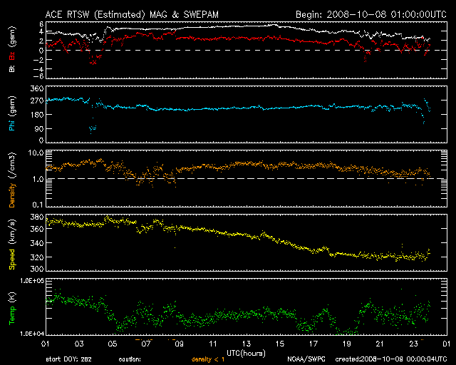 2008/10/ 9 09:02 更新 太陽風はかなり低速になっています(320km/秒)。磁気圏は非常に静穏です。 担当 篠原 り続け、320km/秒とかなり低速になっています。 磁場強度も、図の後半では2nTへ下がっています。 高速風が終わるとともに、とても穏やかな太陽風になっています。 磁気圏も非常に静穏です。 AE指数には、全く変化が見られません。 これは、太陽風の速度が遅くなっていることもありますが、 太陽風の磁場が北寄りになっている(赤線がプラスになっている)ことも、 大きく関係しています。 明日までは、このまま穏やかな状態が続くでしょう。 その後、11日か、12日くらいから、比較的短期間の太陽風の乱れがやってきます。 27日周期の図の、9月14-15日を見てください。 速度上昇の始まる頃に、太陽風磁場が強まって大きく振れています。 この影響で、沖縄の短期変動が大きく変化しています。 これは、極域でオーロラが活発になったことを表しています。 今回も、このくらいのタイミング(10月11-12日頃)に、 活発なオーロラ活動が起こる可能性があります。 週末は、アラスカのライブカメラにも注目して下さい。 放射線帯高エネルギー電子は、ゆっくりと減少しています。 磁気圏が静穏なので、変化はとてもゆっくりです。 太陽は無黒点で、静穏です。 STEREO衛星が撮影した、太陽コロナの写真。9日8時(世界時8日23時)。 (c) NASA ![]() ACEが観測した太陽風の磁場(1番上の枠、白線は全体の強度、赤線は南北成分) および、太陽風の密度(3番目の橙線)、速度(4番目の黄線) (c) NOAA/SWPC ![]() リアルタイムAE指数 下段のAEグラフの値が高くなると、オーロラ活動が活発化しています。 (c) 京都大学, NICT ![]() シベリアで観測された3日間の磁場データ 右側の3分の1が、昨日のデータになります。グラフが上がったり下がったりすると、オーロラ活動が活発化しています。 (c) NICT ![]() 27日の太陽周期に合わせたデータプロット 太陽が同じ面を地球に向けていた27日前の変化から、今後を予想することができます。 (c) NICT