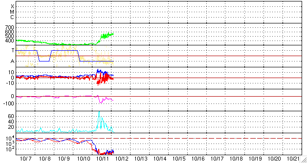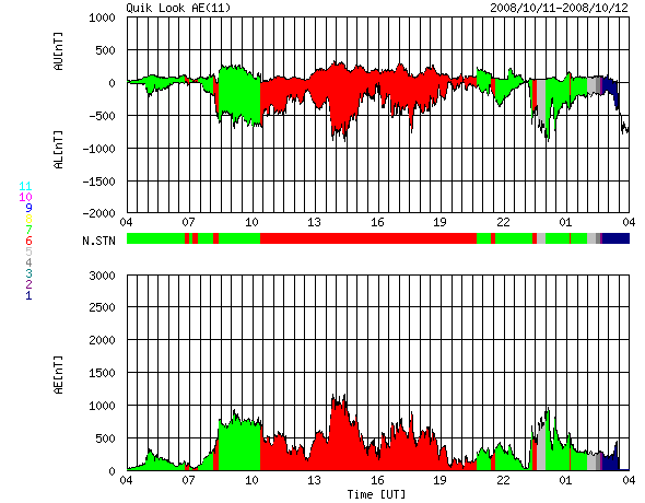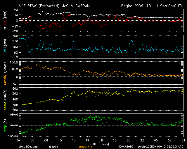 2008/10/12 12:59 更新 高速太陽風がやって来ました。磁気圏活動が活発になり、小規模の磁気嵐になっています。 担当 篠原 高速の太陽風がやって来ました。 27日周期の図で前周期と比較すると、1日ほど変化が早まっています。 SOHO EIT195に見えていた、コロナホールの位置に近いタイミングで始まっています。 速度の変化は、昨日の午後から始まりました(ACEの図の黄色線)。 夕方までに一旦400km/秒まで上昇し、 そこからすぐに500km/秒の高速風に変わっています。 現在の速度は、530km/秒ほどで、それほど高い速度にはなっていません。 前周期の様子と比較しても、今回の高速風はこの程度なのではないでしょうか。 太陽風の速度上昇に先立って、太陽風磁場(白線)が、10nTにまで強まりました。 そして、この時、南北成分(赤線)が大きく南に偏り(マイナス側)、 -10nTから-5nTの南向きが6時間にわたって続きました。 このため、磁気圏が急に活動的になりました。 AE指数の図を見てください。 800〜1000nTの中規模活動が、終日観測されています。 その前までの非常に静穏だった状態から、一転して、活発な磁気圏に変わりました。 また、まとまった南向き磁場が続いたことで、小規模の磁気嵐も発生しています。 沖縄の磁場データを見ると、 静穏レベル(青の横線)から、最大で-100nTの減少が観測されています。 この変化幅は、局地的な値なので、世界規模で磁気嵐を測っているDst指数を見ると、 地球全体では-60nTほどの減少でした。 太陽風磁場が大きく南を向いたものの、速度がまだ遅かったため、 小規模変動にとどまったと考えられます。 今回の高速太陽風は、2〜3日程度と比較的短期間で終わると思います。 現在の磁場強度は、5nTほどです。 これが3nT近くに下がると、高速風も後半です。 磁気圏のオーロラ活動は、今日いっぱい程度で、 明日以降は次第に穏やかになるでしょう。 放射線帯高エネルギー電子は、磁気圏の乱れの影響で、大きく下げています。 これから、増加に転じる可能性が高いので、変化に注意してください。 太陽では、北東部(左上)に1005黒点群が出現しました。 昨日のニュースの時点では、コロナが明るくなっているだけでしたが、 その後、急に出現し、現在は、目立つ大きさに発達しています。 黒点の磁場極性は、北半球の24周期型の[ 白(N) 黒(S) ]です。 南半球と違って、北半球側では、これまでも24期型の黒点が何度も出現しています。 太陽の北東(左上)に、1005黒点群が出現しました。SOHO衛星。12日9時(世界時12日0時)。 (c) SOHO (ESA & NASA) ![]() SOHO衛星による太陽の磁場分布。1005黒点群の磁場分布は24期型です。12日10時(世界時12日1時)。 (c) SOHO (ESA & NASA) ![]() SOHO EIT195による、太陽コロナの様子。12日12時(世界時12日3時)。 (c) SOHO (ESA & NASA) ![]() ACEが観測した太陽風の磁場(1番上の枠、白線は全体の強度、赤線は南北成分) および、太陽風の密度(3番目の橙線)、速度(4番目の黄線) (c) NOAA/SWPC ![]() リアルタイムAE指数 下段のAEグラフの値が高くなると、オーロラ活動が活発化しています。 (c) 京都大学, NICT ![]() シベリアで観測された3日間の磁場データ 右側の3分の1が、昨日のデータになります。グラフが上がったり下がったりすると、オーロラ活動が活発化しています。 (c) NICT ![]() 沖縄の磁場擾乱 下へ下がるほど、擾乱が発達している事を意味します。 (c) NICT ![]() 27日の太陽周期に合わせたデータプロット 太陽が同じ面を地球に向けていた27日前の変化から、今後を予想することができます。 (c) NICT