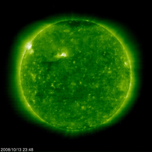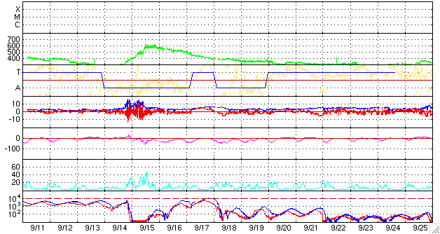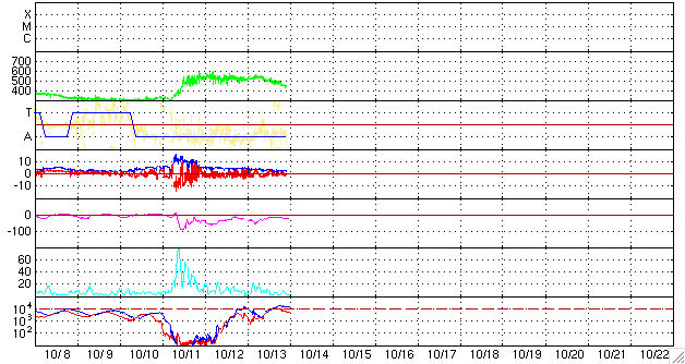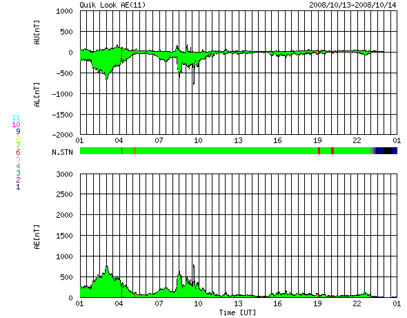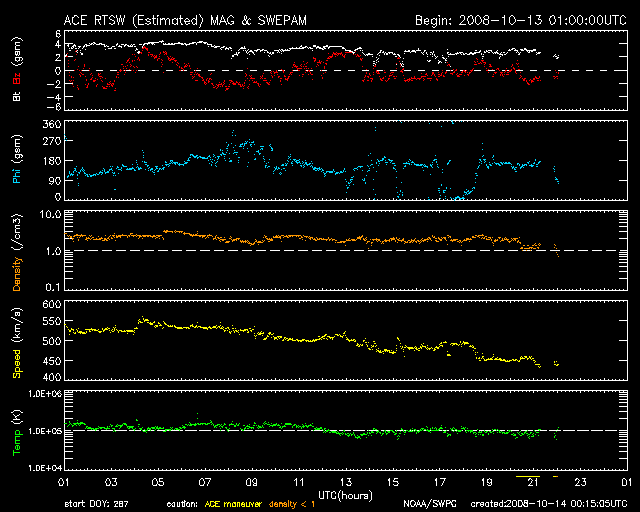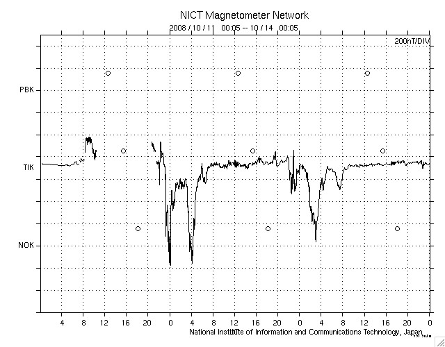 2008/10/14 09:15 更新 太陽風の速度は低下を始め、高速風は終わりつつあります。磁気圏も静穏になってきました。 担当 篠原 太陽風の速度が下がり始めました。 昨日、530km/秒だった太陽風の速度は、 ゆっくりと低下して、現在は450km/秒になっています。 やや高速という速度で、地球はこのまま高速風領域を抜け出すでしょう。 高速太陽風は、今回も2日間程続きました。 27日周期の図で、前周期の様子と比較すると、 最高速度はやや下がったものの、高速状態が安定して続く様になりました。 また、最初に磁場強度が大きく強まって、 活発な磁気圏活動を起こすという点は、今回も共通していました。 そのオーロラ活動ですが、今回の高速風の始まりに見られたオーロラを、 アラスカのライブカメラの映像で紹介します。 1枚目に掲載している動画は、11日17〜18時半(世界時11日8〜9時半)のオーロラです。 27日周期の図で、沖縄の磁場データが大きく変化を始めた、最初の部分に相当します。 アラスカでは、夜もすっかり長くなり、本格的なオーロラ観望の季節になっています。 現在の磁気圏は、太陽風の速度が下がるとともに、活動は弱まっています。 AE指数の図では、前半は700nTほどの中規模活動が続いていますが、 後半は、変化が見えなくなっています。 この切り替わり方はやや極端ですが、今後、穏やかになることは間違いないでしょう。 高速風領域を抜け出すと、これから長い静穏期間が始まります。 掲載している27日周期の図では、次の擾乱はまだ見えていません。 次の高速風は、2週間ほど先の10月27日ころになるでしょう。 放射線帯高エネルギー電子は、10,000のレベルを保っています。 磁気圏が静穏になると、減少はとてもゆっくりっです。 これから数日間ほど、警戒状態が続くでしょう。 太陽では、1005黒点群が見えています。 SOHO EIT195では、注目していた太陽の東端の明るい領域が上がって来ましたが、 やや磁場が強まっている程度で、今のところ黒点にはなっていない様です。 アラスカのオーロラライブカメラで撮影された、11日17〜18時半(現地11日0時〜2日1時半、世界時11日8〜9時半)のオーロラ。 (c) NICT/SALMON ![]() SOHO EIT195による、太陽コロナの様子。14日9時(世界時14日0時)。 (c) SOHO (ESA & NASA) ![]() ACEが観測した太陽風の磁場(1番上の枠、白線は全体の強度、赤線は南北成分) および、太陽風の密度(3番目の橙線)、速度(4番目の黄線) (c) NOAA/SWPC ![]() リアルタイムAE指数 下段のAEグラフの値が高くなると、オーロラ活動が活発化しています。 (c) 京都大学, NICT ![]() シベリアで観測された3日間の磁場データ 右側の3分の1が、昨日のデータになります。グラフが上がったり下がったりすると、オーロラ活動が活発化しています。 (c) NICT ![]() 27日の太陽周期に合わせたデータプロット 太陽が同じ面を地球に向けていた27日前の変化から、今後を予想することができます。 (c) NICT