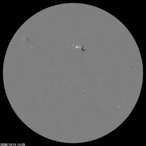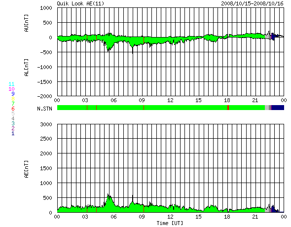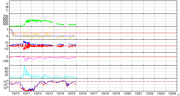 2008/10/16 08:53 更新 やや低速の太陽風が続いています。磁気圏では、小規模の活動が続きました。 担当 篠原 太陽風は、速度が370km/秒とやや低速で安定しています。 磁場強度は、5nTから4nTへやや下がった印象です。 穏やかな太陽風が続いています。 AE指数は、全体的に200nTほどの太さがあり、 加えて、前半に2ヶ所ほど、さらに飛び出した時間帯があります。 太陽風磁場の南北成分を見ると、 図の前半は-3nTほどの南向きが続いています。 これらの影響で、小規模の磁気圏活動が続いていたのかもしれません。 シベリア磁場データでも、小さな幅の変動が続いています。 穏やかな太陽風は、今後も10日間程度続くでしょう。 SOHO EIT195の太陽コロナ写真では、コロナホールは見えていません。 放射線帯高エネルギー電子は、磁気圏活動の影響でやや下がり、 警戒ラインを割りそうです。 太陽では、1005黒点群が見えています。 今日の2枚目に太陽の磁場写真を掲載しています。 太陽の南西(右下)を見てください。 小さく、磁場が強まった領域があります。 SOHO EIT195では、ここは小さく明るく光っています。 黒点にはなっていませんが、この磁場の並びは、南半球の第24活動周期の順番です。 少しずつ、太陽の変化は進んでいるのでしょう。 SOHOによる太陽の可視光写真。1005黒点群が見えています。16日1時(世界時15日16時) (c) SOHO (ESA & NASA) ![]() SOHOによる太陽の磁場写真。南西(右下)に24期型の小さな磁場の強まりが見えます。15日23時半(世界時15日14時半) (c) SOHO (ESA & NASA) ![]() SOHO EIT195による、太陽コロナの様子。16日1時半(世界時15日16時半)。 (c) SOHO (ESA & NASA) ![]() ACEが観測した太陽風の磁場(1番上の枠、白線は全体の強度、赤線は南北成分) および、太陽風の密度(3番目の橙線)、速度(4番目の黄線) (c) NOAA/SWPC ![]() リアルタイムAE指数 下段のAEグラフの値が高くなると、オーロラ活動が活発化しています。 (c) 京都大学, NICT ![]() シベリアで観測された3日間の磁場データ 右側の3分の1が、昨日のデータになります。グラフが上がったり下がったりすると、オーロラ活動が活発化しています。 (c) NICT ![]() 27日の太陽周期に合わせたデータプロット 太陽が同じ面を地球に向けていた27日前の変化から、今後を予想することができます。 (c) NICT