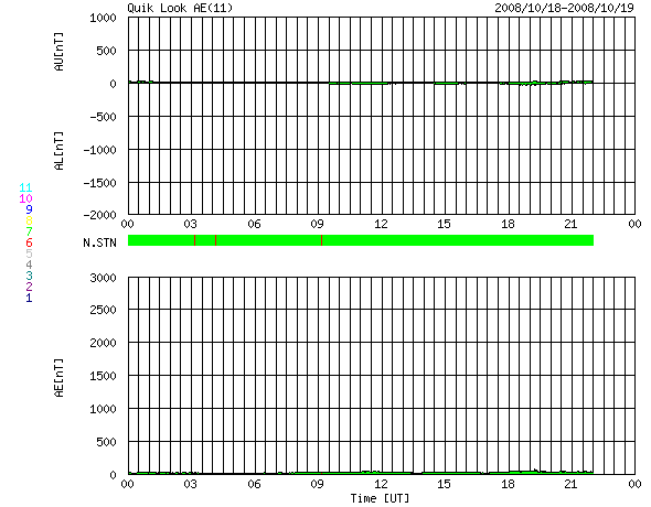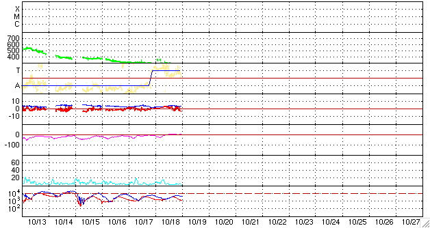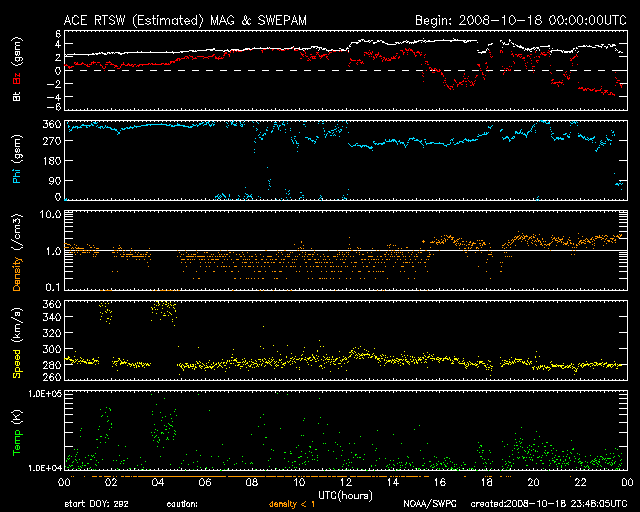 2008/10/19 08:49 更新 かなり低速の太陽風が続いています(280km/秒)。磁気圏も非常に静穏です。 担当 篠原 たいへん低速の太陽風が続いています。 太陽風の速度は、280km/秒の低速状態で安定しています。 磁場強度も、2〜4nTの範囲で変化していて、やや弱めです。 とても穏やかな太陽風が続いています。 このため、磁気圏も非常に静穏です。 今日のAE指数のグラフは、完全に平坦で、全く変化が見られません。 シベリア磁場データの3日間のグラフでは、 前の2日間は、小さな変動が時々見えていたのですが、 昨日(右側の3分の1)は、全く変化がありません。 穏やかな宇宙天気は、まだ8〜9日ほど続きます。 27日周期の図を見てください。 次の高速風が、前周期のグラフの右端にようやく見えて来ました。 このタイミングまで、静穏な状態は続くでしょう。 SOHO EIT195では、コロナホールはまだ見えていません。 一方、地球を3日ほど先回りしている、STEREO Behindでは、 既にコロナホールが東端に顔を出しています。 SOHOでも、明日か明後日くらいに見えて来そうです。 放射線帯高エネルギー電子は、数千のレベルでやや高めの状態です。 引き続き、ゆっくりと減少して行くでしょう。 太陽は1006黒点群が去り、無黒点に戻っています。 SOHO EIT195による、太陽コロナの様子。19日8時半(世界時18日23時半)。 (c) SOHO (ESA & NASA) ![]() ACEが観測した太陽風の磁場(1番上の枠、白線は全体の強度、赤線は南北成分) および、太陽風の密度(3番目の橙線)、速度(4番目の黄線) (c) NOAA/SWPC ![]() リアルタイムAE指数 下段のAEグラフの値が高くなると、オーロラ活動が活発化しています。 (c) 京都大学, NICT ![]() シベリアで観測された3日間の磁場データ 右側の3分の1が、昨日のデータになります。グラフが上がったり下がったりすると、オーロラ活動が活発化しています。 (c) NICT ![]() 27日の太陽周期に合わせたデータプロット 太陽が同じ面を地球に向けていた27日前の変化から、今後を予想することができます。 (c) NICT