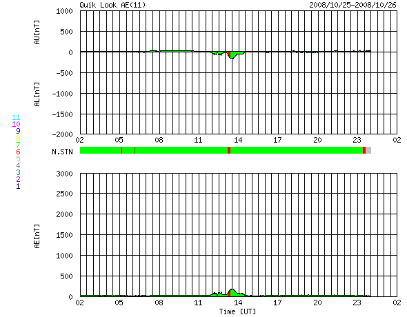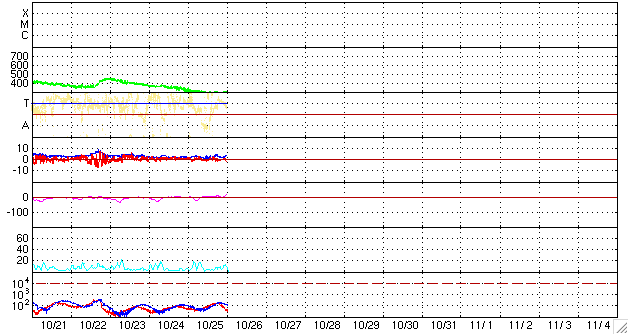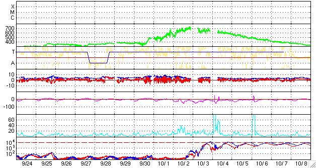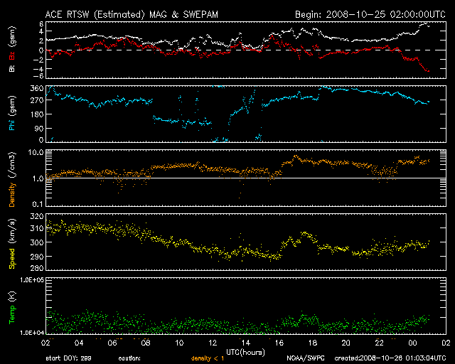 2008/10/26 10:04 更新 300km/秒の遅い太陽風が続いています。磁気圏もたいへん静かです。 2008/10/26 12:38 追加 SOHO EIT195の最新画像を追加 担当 篠原 低速の太陽風が続いています。 太陽風の速度は、300km/秒とかなり遅い速度で安定しています。 磁場強度も2nT付近で弱まったままです。 このため、磁気圏も非常に静穏です。 オーロラ活動を測っているAE指数のグラフは、ほとんど変化していません。 この穏やかな状態は、明日くらいまで続くでしょう。 28日頃から、高速の太陽風がやってくると予想しています。 SOHO衛星のデータがまだ見られないので、 STEREOの太陽コロナ写真を掲載します(こちらは繋がりました)。 STEREO Behindは、地球よりも3日ほど先の太陽を見ています。 コロナホールは、既に太陽の西半球(右半分)に移動していて、 高速太陽風が始まっていてもよい頃です。 29日には、SOHOで同様の写真を見ることができるでしょう。 西側に大きく広がるコロナホールの形は、前周期と似ています。 到来する高速風も、概ね似た変化をするのではないでしょうか。 また、太陽の中心やや北(上)に、小さなコロナホールが見えています。 今回、新しく現れた領域の様です。 SOHOが見られないため、太陽の様子も分かりませんが、 NOAA SWPCの報告では、黒点はないそうです。 STEREOの太陽コロナにも、特に明るい領域は見られません。 2008/10/26 12:38 追加 (篠原) 関連の図はページの最後にあります SOHOのページにアクセスできるようになりました。 太陽コロナの最新画像です。 コロナホールの右端は、太陽の中心線をちょうど通過したところです。 前周期と比べると、コロナホールの右側が少し縮んだ様に見えます。 高速風の到来は前周期よりも遅れて、28日の後半になるかもしれません。 STEREO衛星が撮影した、太陽コロナの写真。25日23時(世界時25日14時)。 (c) NASA ![]() ACEが観測した太陽風の磁場(1番上の枠、白線は全体の強度、赤線は南北成分) および、太陽風の密度(3番目の橙線)、速度(4番目の黄線) (c) NOAA/SWPC ![]() リアルタイムAE指数 下段のAEグラフの値が高くなると、オーロラ活動が活発化しています。 (c) 京都大学, NICT ![]() シベリアで観測された3日間の磁場データ 右側の3分の1が、昨日のデータになります。グラフが上がったり下がったりすると、オーロラ活動が活発化しています。 (c) NICT ![]() 27日の太陽周期に合わせたデータプロット 太陽が同じ面を地球に向けていた27日前の変化から、今後を予想することができます。 (c) NICT