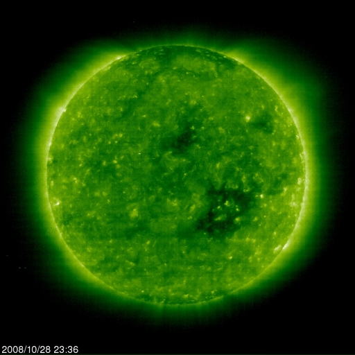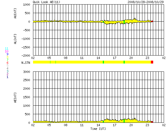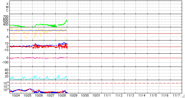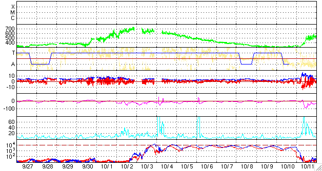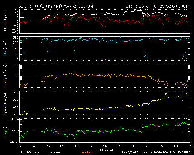 2008/10/29 10:47 更新 高速太陽風がやって来ました。速度は550km/秒に上がっていますが、磁気圏はまだ静穏です。 担当 篠原 宇宙天気ニュースは、5周年を迎えました! 今日までニュースを続けられたのは、みなさまのアクセスのおかげです。 まだまだ、太陽活動の極大を目指して続けて行きたいと思います。 今後もよろしくお願いします。 5周年を記念して、アストロちゃん(実は名前を持っていたのです!)が来てくれました。 宇宙遊泳を5年間続けて、初めての素顔です。 女の子なので、驚きましたか? さて、昨夜遅く、太陽風の速度が上昇を始め、高速太陽風が始まりました。 速度は400km/秒から550km/秒へ上昇しています。 それに先だって、昨日のニュースの後くらいから、磁場強度も強まっています。 10nTくらいに上昇し、現在までその状態が続いています。 磁気圏への影響を決める磁場の南北成分は、ほとんど北向きで安定していました。 このため、オーロラ活動はほとんど強まっていません。 AE指数は、200nTの小さな変化が起きた程度です。 昨夜は、アラスカのライブカメラを見ていたのですが、 オーロラの光はほとんど見られませんでした。 ただ、磁場の方向は比較的簡単に切り替わります。 今後、南寄りに傾向が変わると、速度が高く、磁場も強まったままなので、 オーロラは一気に活動を強めるでしょう。 引き続き、ライブカメラにも注目して下さい。 前周期を参考にすると、太陽風の速度はまだ上昇を続けそうです。 前回は700km/秒まで達しています。 明後日くらいまでは、高速風の勢いも強く、磁気圏の活動も活発になる可能性があります。 放射線帯高エネルギー電子は、現在は低い状態です。 高速風の影響で、これから増加する可能性があります。 変化に注意して下さい。 SOHO EIT195カメラによる、太陽コロナの様子。29日8時半(世界時28日23時半)。 (c) SOHO (ESA & NASA) ![]() ACEが観測した太陽風の磁場(1番上の枠、白線は全体の強度、赤線は南北成分) および、太陽風の密度(3番目の橙線)、速度(4番目の黄線) (c) NOAA/SWPC ![]() リアルタイムAE指数 下段のAEグラフの値が高くなると、オーロラ活動が活発化しています。 (c) 京都大学, NICT ![]() シベリアで観測された3日間の磁場データ 右側の3分の1が、昨日のデータになります。グラフが上がったり下がったりすると、オーロラ活動が活発化しています。 (c) NICT ![]() 27日の太陽周期に合わせたデータプロット 太陽が同じ面を地球に向けていた27日前の変化から、今後を予想することができます。 (c) NICT