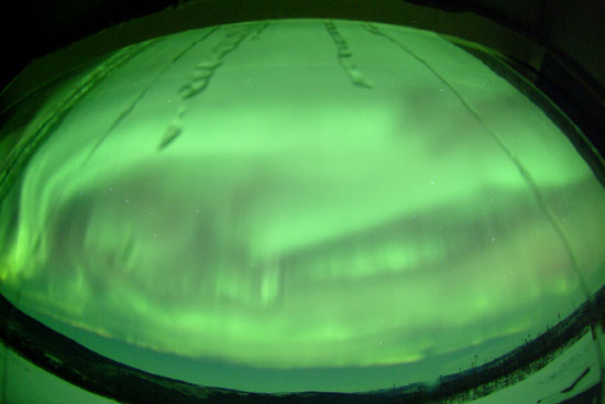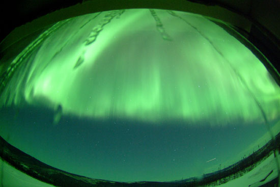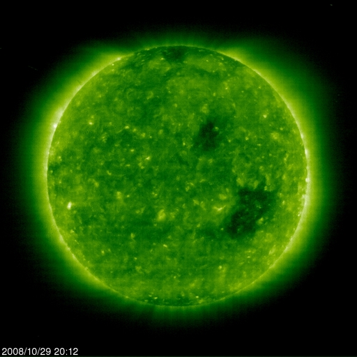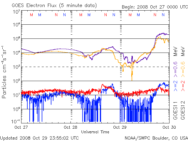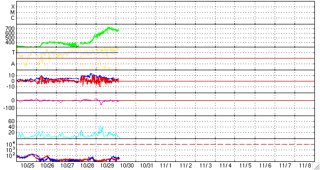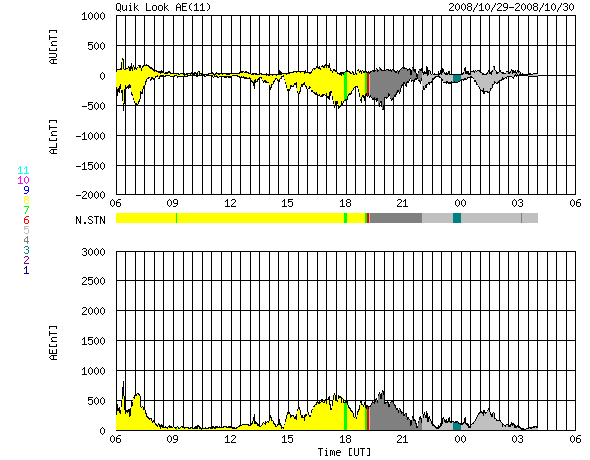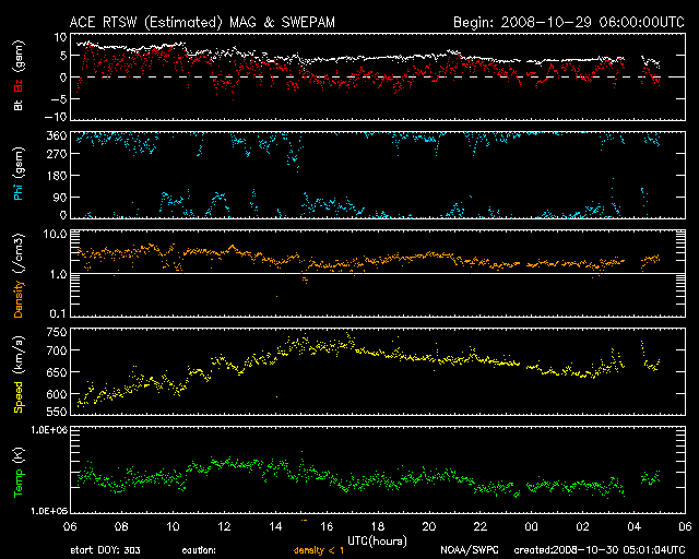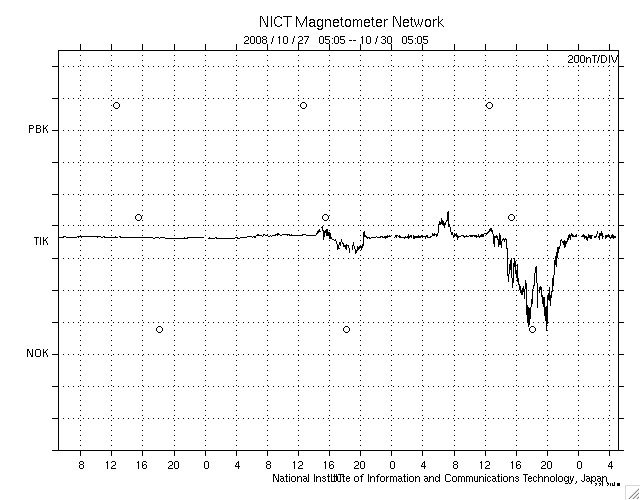 2008/10/30 14:01 更新 600km/秒台後半の太陽風が続いています。オーロラもある程度活動的になっています。 担当 篠原 太陽風の速度は更に上がり、30日0時(世界時29日15時)に、700km/秒に達しました。 反対に、磁場強度はゆっくりと弱まり、この頃に5nTを割っています。 この辺りで、高速風はピークに達した様です。 以後、太陽風の速度は少し下がって、650km/秒程度になっています 太陽風磁場の南北成分は、0nT付近で小さく変化する様になりました。 多少、南向きが含まれる様になり、速度が700km/秒まで上がったことで、 中・小規模のオーロラ活動が発生しています。 AE指数では、300〜500nTの変動が発生する様になっています。 昨夜は、アラスカのライブカメラでも、時々オーロラ活動が記録されていました。 そのうちの2枚を紹介します。 5分の間隔で撮影されたものです。 AE指数のグラフでは、最初に見られている変化に対応します。 太陽風の速度は、もうしばらく高速状態が続くでしょう。 明日くらいまでは、オーロラ活動も期待できますが、 南向きの傾向ではないので、あまり大きな変動にはならないだろうと思います。 4日後くらいには、太陽風の速度は下がり、通常の太陽風に戻りそうです。 放射線帯高エネルギー電子は、まだ目立った増加を起こしていません。 もうしばらく注視が必要です。 太陽は無黒点で、たいへん穏やかです。 アラスカのオーロラライブカメラによる、29日15:16(現地28日21:16、世界時29日06:16)のオーロラ。 (c) NICT/SALMON ![]() アラスカのオーロラライブカメラによる、5分後のオーロラの様子。 (c) NICT/SALMON ![]() SOHO EIT195による、太陽コロナの様子。30日5時(世界時29日20時)。 (c) SOHO (ESA & NASA) ![]() ACEが観測した太陽風の磁場(1番上の枠、白線は全体の強度、赤線は南北成分) および、太陽風の密度(3番目の橙線)、速度(4番目の黄線) (c) NOAA/SWPC ![]() リアルタイムAE指数 下段のAEグラフの値が高くなると、オーロラ活動が活発化しています。 (c) 京都大学, NICT ![]() シベリアで観測された3日間の磁場データ 右側の3分の1が、昨日のデータになります。グラフが上がったり下がったりすると、オーロラ活動が活発化しています。 (c) NICT ![]() 27日の太陽周期に合わせたデータプロット 太陽が同じ面を地球に向けていた27日前の変化から、今後を予想することができます。 (c) NICT