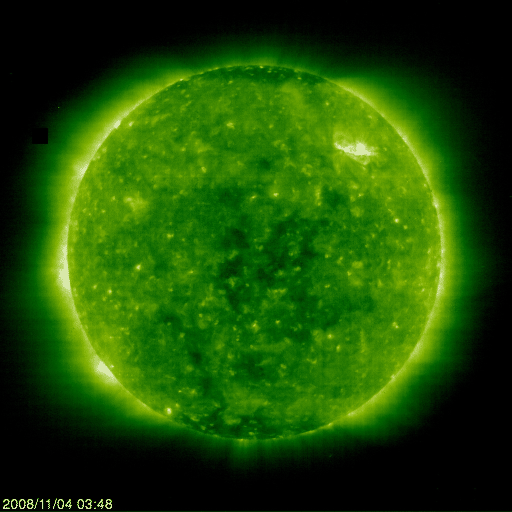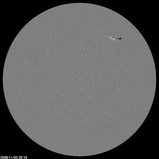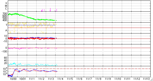 2008/11/ 4 13:48 更新 Cクラスの小規模フレアが、2回発生しました。4月以来です。 担当 篠原 今日は、大ニュースです。 昨夜、3日20時(世界時3日11時)と今日のお昼、4日12時(世界時4日3時)に、 1007黒点群でCクラスの小規模フレアが2回発生しました。 ひとつめは、C1.6、ふたつめは、C1.1と、どちらもぎりぎりのCクラスです。 Cクラスのフレアが発生したのは、4月3日以来、7ヶ月ぶりのことです。 しかも、今回は、新しい活動周期の第24活動周期の黒点群で発生した、 初めてのCクラス以上のフレアです。 GOESのX線のグラフが、こんなにギザギザになったのは、久しぶりです。 太陽は、またひとつ、活発化の兆しを見せてくれました。 Cクラスにやっと届こうかという規模の活動で、 こんなに騒いでいてはいけないのですが。 1007黒点群は、現在も2つの目立った点となって見えています。 黒点の距離が離れ、黒点の大きさは小さくなった様です。 磁場の分布は、白と黒が並走する様に細長く伸びています。 今後は弱まって行くのでしょうか。 太陽風は、ゆっくりと速度を下げています。 420km/秒から380km/秒へ、やや低速風に変わって来ました。 磁場強度も3nTあたりで、弱めです。 昨日は、磁気圏活動はほとんど起こらなかった様です。 AE指数のグラフは全く静穏です。 27日周期の図によると、この静かな状態はもう3日ほど続くでしょう。 SOHO EIT195では、コロナホールは太陽の中心に来ています。 この位置だと、もう2日ほどで高速風が来ても良いのですが、 このコロナホールは出だしが遅れるようです。 SOHOによる太陽の可視光写真。1007黒点群で、Cクラスのフレアが発生しました。4日4時(世界時3日19時) (c) SOHO (ESA & NASA) ![]() 太陽の磁場分布。白と黒は、1007黒点群です。4日5時半(世界時3日20時半) (c) SOHO (ESA & NASA) ![]() SOHO EIT195による、太陽コロナの様子。4日13時(世界時4日4時)。 (c) SOHO (ESA & NASA) ![]() GOES衛星の太陽X線データ (c) NOAA/SWPC ![]() ACEが観測した太陽風の磁場(1番上の枠、白線は全体の強度、赤線は南北成分) および、太陽風の密度(3番目の橙線)、速度(4番目の黄線) (c) NOAA/SWPC ![]() リアルタイムAE指数 下段のAEグラフの値が高くなると、オーロラ活動が活発化しています。 (c) 京都大学, NICT ![]() シベリアで観測された3日間の磁場データ 右側の3分の1が、昨日のデータになります。グラフが上がったり下がったりすると、オーロラ活動が活発化しています。 (c) NICT ![]() 27日の太陽周期に合わせたデータプロット 太陽が同じ面を地球に向けていた27日前の変化から、今後を予想することができます。 (c) NICT