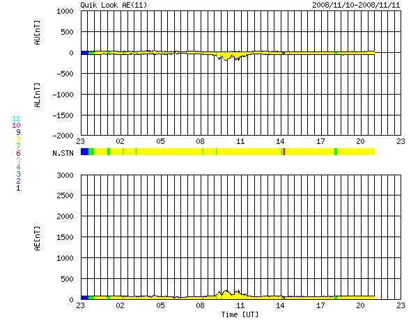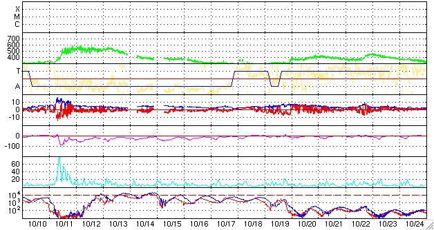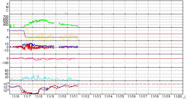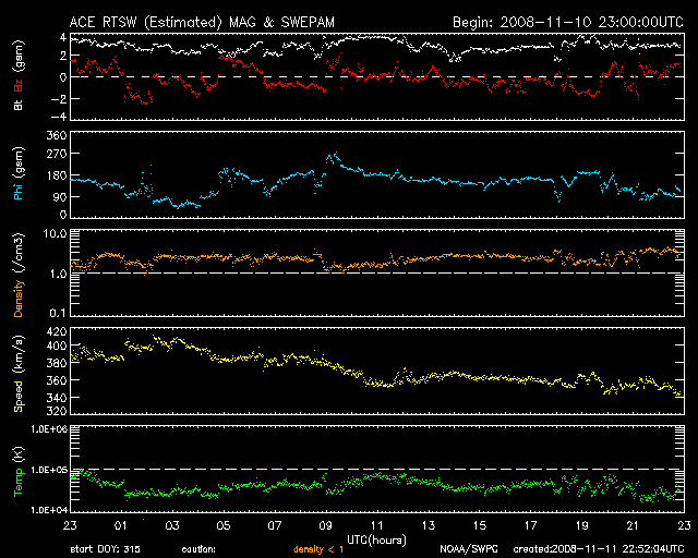 2008/11/12 07:53 更新 太陽風は低速風になりました(360km/秒)。穏やかな宇宙天気が続きます。 担当 篠原 太陽風の速度は、360km/秒に低下しています。 これからしばらく、低速の太陽風が続きます。 磁場強度も3nTに弱まっています。 地球の磁気圏もとても穏やかです。 AE指数には、小さな山がひとつ見えるだけです。 この穏やかな宇宙天気は、これから2週間近く続く可能性があります。 掲載している27日周期の図では、次の乱れはまだ見えていません。 11月24日以降と予想されます。 放射線帯高エネルギー電子は、数千のレベルで安定しています。 今後はゆっくりと減少するでしょう。 太陽には、1008黒点群が見えているそうです。 SOHOの可視光写真が更新されていないので、代わりに磁場写真を掲載します。 太陽の北半球側(上側)に磁場の強まりが見えています。 ここが1008黒点群です。 白(N極)と黒(S極)の順番は、新しい活動周期の第24期の順番です。 白と黒ははっきりと分かれていて、活動度は低いだろうと思います。 それでも、Cクラスの小規模フレア程度は発生するかもしれません。 SOHO EIT195による、太陽の磁場分布。磁場の強まりは1008黒点群です。12日6時(世界時11日21時)。 (c) SOHO (ESA & NASA) ![]() SOHO EIT195による、太陽コロナの様子。12日7時(世界時11日22時)。 (c) SOHO (ESA & NASA) ![]() ACEが観測した太陽風の磁場(1番上の枠、白線は全体の強度、赤線は南北成分) および、太陽風の密度(3番目の橙線)、速度(4番目の黄線) (c) NOAA/SWPC ![]() リアルタイムAE指数 下段のAEグラフの値が高くなると、オーロラ活動が活発化しています。 (c) 京都大学, NICT ![]() シベリアで観測された3日間の磁場データ 右側の3分の1が、昨日のデータになります。グラフが上がったり下がったりすると、オーロラ活動が活発化しています。 (c) NICT ![]() 27日の太陽周期に合わせたデータプロット 太陽が同じ面を地球に向けていた27日前の変化から、今後を予想することができます。 (c) NICT