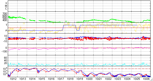 GOES衛星の太陽X線データ (c) NOAA/SWPC ![]() ACEが観測した太陽風の磁場(1番上の枠、白線は全体の強度、赤線は南北成分) および、太陽風の密度(3番目の橙線)、速度(4番目の黄線) (c) NOAA/SWPC ![]() リアルタイムAE指数 下段のAEグラフの値が高くなると、オーロラ活動が活発化しています。 (c) 京都大学, NICT ![]() シベリアで観測された3日間の磁場データ 右側の3分の1が、昨日のデータになります。グラフが上がったり下がったりすると、オーロラ活動が活発化しています。 (c) NICT ![]() 27日の太陽周期に合わせたデータプロット 太陽が同じ面を地球に向けていた27日前の変化から、今後を予想することができます。 (c) NICT