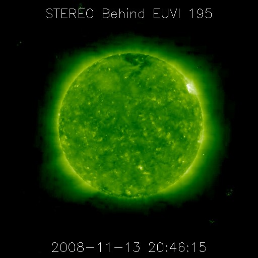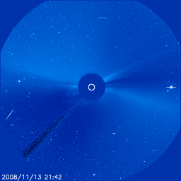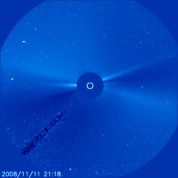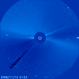 2008/11/14 09:22 更新 太陽風はかなり低速で(290km/秒)、磁気圏も静穏です。1008黒点群が見えています。 2008/11/14 10:50 追加 [訂正] SOHO LASCO C3写真の解説に誤りがありました。 担当 篠原 SOHO衛星の可視光太陽写真が更新されました。 1枚目の写真を見てください。 太陽の北西(右上)の高い緯度側に1008黒点群が見えています。 X線のグラフは、変化が小さくなっている様で、 黒点群の活動度は低いままです。 太陽活動は、穏やかな状態が続くでしょう。 今日は、SOHO EIT195の写真が更新されていないので、 STEREO Behind衛星の太陽コロナ写真を掲載します。 衛星の位置の関係で、STEREO Behindは地球よりも3日ほど先の太陽の姿を見ています。 この写真では、1008黒点群は太陽の西端に沈みつつあります。 太陽全体がぼんやりと光っていて、コロナホールの姿は特に見られません。 次の高速風をもたらすコロナホールは、 この写真の太陽の東端ぎりぎりにあります。 明日、明後日には見えて来る様で、 SOHO衛星でも、もう4-5日ほどすると見えて来るでしょう。 現在の太陽風は、速度が290km/秒を割るほどに下がり、かなり低速です。 磁場強度も2nTに弱まっています。 かなり穏やかな太陽風です。 今日か明日に、多少変化が見られるかもしれないと書いていますが、 今のところ気配は見られません。 どうなるでしょうか。 磁気圏活動も静かです。 太陽風磁場が、弱いながらも南向きになったりしているのですが、 速度が下がりきっているので、目立った活動にはなっていません。 穏やかな状態はまだまだ続きます。 前周期の次の太陽風の乱れは、10月28-29日に始まりました。 掲載している27日周期の図には、まだそこまで入っていません。 SOHO LASCO C3カメラの右側から、水星が姿を現しました。 次第に太陽に近づいています。 やがて、写真の左側に火星が見えて来そうです。 しばらくの間、LASCO C3の写真がにぎやかになります。 2008/11/14 10:50 追加 (篠原) 関連の図はページの最後にあります SOHO LASCO C3の画面の左側には、既に火星が見えていました。 太陽をはさんで、水星とほとんど対称の位置に見えている、やや明るい星が火星です。 3枚の写真を見比べると、星の間を少しずつ動いています。 もう少し明るく見えるだろうと期待していたので、勘違いしてしまいました。 申し訳ありません。 水星は、これから3週間ほどかけて、画面を左へ横切って行きます。 一方、火星は右へ移動しますが、画面を横切るまでに1ヶ月半近くかかります。 SOHOによる太陽の可視光写真。1008黒点群が見えています。14日6時(世界時13日21時) (c) SOHO (ESA & NASA) ![]() STEREO behind衛星による太陽コロナ写真。地球よりも3日ほど先の見え方です。14日6時(世界時13日21時) (c) NASA ![]() SOHO衛星のLASCO C3カメラの映像 (c) SOHO (ESA & NASA)
