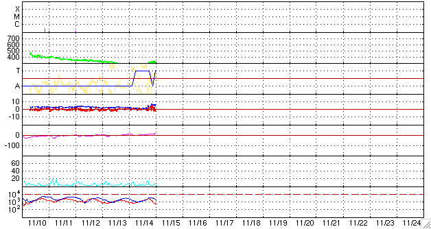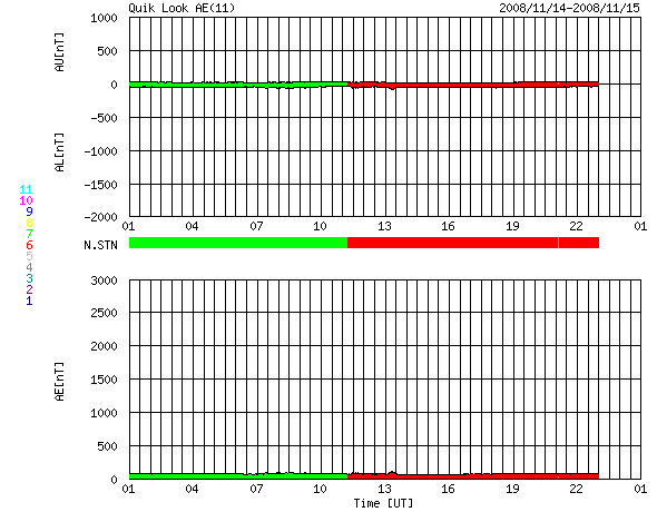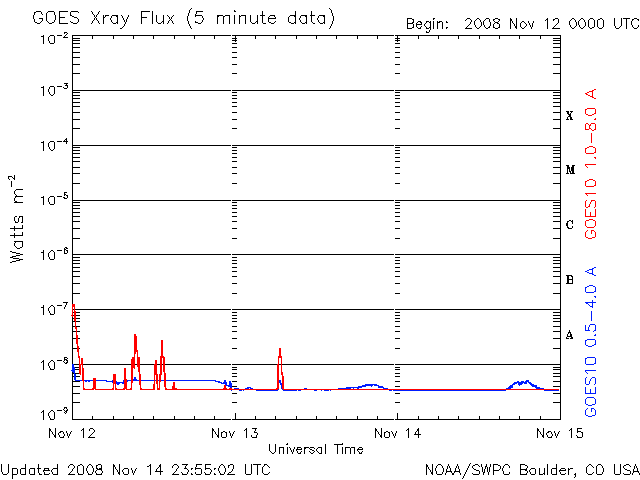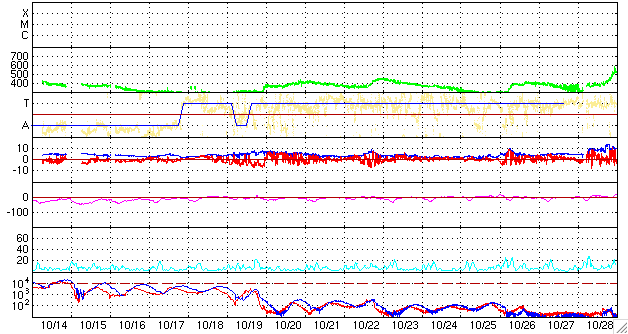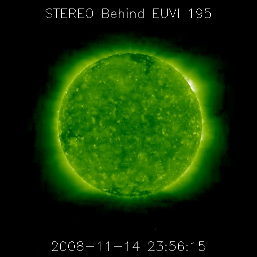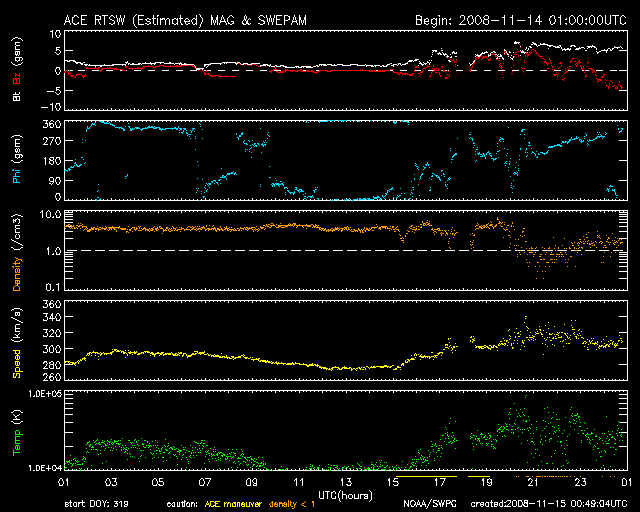 2008/11/15 09:50 更新 太陽風は低速で(310km/秒)、磁気圏はとても静かです。 担当 篠原 今日もSOHOの写真がありませんので、STEREO Behindの太陽コロナ写真を掲載します。 この衛星は、地球よりも3日ほど先の太陽を見ています。 太陽の東端から、コロナホールが姿を現しています。 この影響が地球にやってくるのは、まだ10日ほど先、25日頃と予想されます。 やがて、コロナホールの全体が見える様になれば、 今後の予想もできるようになるでしょう。 太陽風は、昨日より、速度280km/秒とかなり遅い状態でした。 15日1時(世界時14日16時)に、磁場強度が5nTヘ少し強まり、 速度も310km/秒ほどへ上がっています。 太陽風の状態に変化が見られるかもしれないと書いていましたが、 この程度の、たいへん小さな変動だったようです。 今後も、基本的には、低速の穏やかな太陽風が続くでしょう。 磁気圏も非常に静穏です。 AE指数には全く変化が見られません。 太陽には、1008黒点群が残っているそうです。 可視光写真が更新されていないので、磁場写真を掲載します。 北西(右上)の磁場の強まりが1008黒点群です。 X線データに変化はなく、活動は穏やかです。 STEREO衛星が撮影した、太陽コロナの写真。15日9時(世界時15日0時)。 (c) NASA ![]() SOHOによる太陽の磁場写真。磁場の強まりは1008黒点群です。15日6時(世界時14日21時) (c) SOHO (ESA & NASA) ![]() ACEが観測した太陽風の磁場(1番上の枠、白線は全体の強度、赤線は南北成分) および、太陽風の密度(3番目の橙線)、速度(4番目の黄線) (c) NOAA/SWPC ![]() リアルタイムAE指数 下段のAEグラフの値が高くなると、オーロラ活動が活発化しています。 (c) 京都大学, NICT ![]() シベリアで観測された3日間の磁場データ 右側の3分の1が、昨日のデータになります。グラフが上がったり下がったりすると、オーロラ活動が活発化しています。 (c) NICT ![]() 27日の太陽周期に合わせたデータプロット 太陽が同じ面を地球に向けていた27日前の変化から、今後を予想することができます。 (c) NICT
