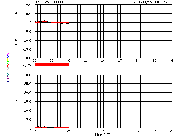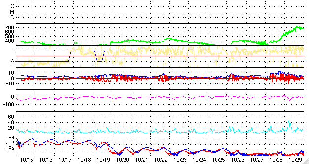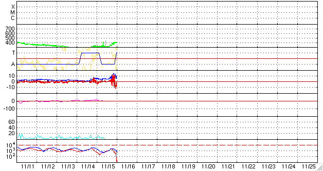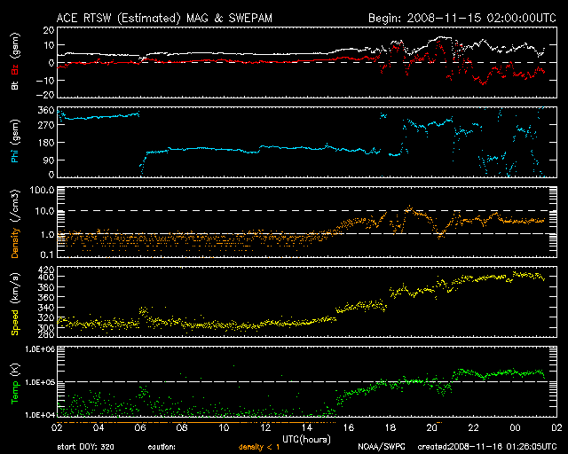 2008/11/16 10:28 更新 太陽風の速度は400km/秒に上昇しています。磁気圏活動もある程度強まっているでしょう。 担当 篠原 太陽風の速度が、400km/秒に上がりました。 変化は、16日0時(世界時15日15時)頃に始まりました。 それまで、320km/秒程度だった太陽風の速度は、ゆっくりと上昇し、 半日ほどかけて400km/秒に達しています。 変化の大きさとしては、通常の速度に戻った程度です。 速度の変化とともに、太陽風の磁場も強まりました。 磁場強度が10nTに上がり、南北成分も大きく南北に変化しています。 最大で、-10nTに達した時間帯もあります。 27日周期の図を見ると、前周期の10月20日にも、 太陽風の速度、磁場強度が強まる変化が見られました。 今回、この回帰がどうなるか注目していたのですが、 磁場に関しては、変化の幅が強まっています。 ACEの最新の部分(図の右端)では、磁場強度は5nTに弱まっています。 このままであれば、速度の上昇はこのあたりで止まりそうです。 太陽には、目立ったコロナホールも見られませんでしたから、 大きな変動が来ることはないでしょう。 この変化がどのように続くのか、しばらく注目してください。 太陽風の磁場が大きく変動していることと、速度がある程度回復していることから、 磁気圏活動もある程度強まっていると予想されます。 しかし、AE指数、沖縄の磁場データともに、データが止まっていて、 現状を見ることができません。 シベリア磁場データは、ほとんど変化していませんが、 一つの観測点だけでは、地方時の依存性があるため、 このデータだけで地球規模で静穏かどうかは分かりません。 太陽風の状況から、中規模程度の磁気圏の乱れは発生しているのではないかと思います。 データの回復を待ちながら、様子を見たいところです。 今回の太陽風の変化は、4日程度続く可能性があります。 この半年ほど安定していた太陽風の周期性に、変化が始まっているのかもしれません。 太陽には、1008黒点群があるそうですが、活動はなくたいへん穏やかです。 STEREO衛星が撮影した、太陽コロナの写真。地球よりも、3日ほど先の太陽を見ています。16日9時(世界時16日0時)。 (c) NASA ![]() SOHOによる太陽の磁場写真。磁場の強まりは1008黒点群です。16日1時(世界時15日16時) (c) SOHO (ESA & NASA) ![]() ACEが観測した太陽風の磁場(1番上の枠、白線は全体の強度、赤線は南北成分) および、太陽風の密度(3番目の橙線)、速度(4番目の黄線) (c) NOAA/SWPC ![]() リアルタイムAE指数 下段のAEグラフの値が高くなると、オーロラ活動が活発化しています。 (c) 京都大学, NICT ![]() シベリアで観測された3日間の磁場データ 右側の3分の1が、昨日のデータになります。グラフが上がったり下がったりすると、オーロラ活動が活発化しています。 (c) NICT ![]() 27日の太陽周期に合わせたデータプロット 太陽が同じ面を地球に向けていた27日前の変化から、今後を予想することができます。 (c) NICT