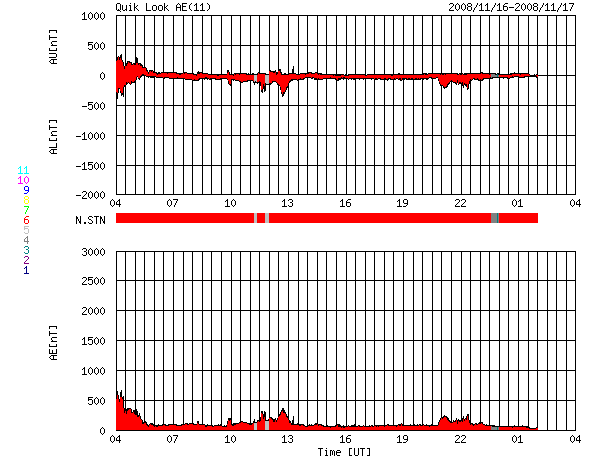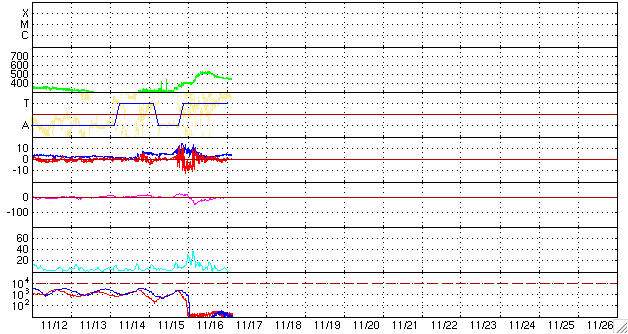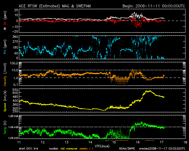 2008/11/17 12:49 更新 太陽風の速度は520km/秒に上昇し、小規模の高速風がやって来ました。既に速度は下がりつつあります。 担当 篠原 昨日のニュース以降、太陽風の速度は更に上昇を続け、 16日16時(世界時16日7時)に、520km/秒に達しました。 予想以上に、速度の高い風がやってきました。 太陽風は、そのまま6時間ほど520km/秒を保ち、 昨夜、16日22時(世界時16日13時)頃からゆっくりと低下に転じています。 現在は、450km/秒で、速度低下も一段落し、落ち着いているところです。 今日の1枚目に、1週間の太陽風の図を掲載します。 16日に今回の高速風の山が見えています(黄色線)。 それに先立って、磁場強度(白線)、密度(橙色線)がそれぞれ強まっていて、 小規模ながらも、高速風の変化パターンを見せています。 27日周期の図で、前周期を振り返ると、 ちょうど今回と同じタイミング(10月20日)に、速度400km/秒の小さな盛り上がりが見られ、 磁場も、ゆるやかに強まっていました。 今回、この太陽風の変化がより強まった形で回帰しました。 この傾向が強まるのかどうか、次回以降の変化が注目されます。 太陽風の変化に合わせて、磁気圏もやや活動的になっています。 ただ、太陽風磁場の南北成分が、速度が上昇する前に大きく南を向いたものの、 速度が上がる頃には北向きに転じてしまったので、 影響は前半だけにとどまり、それほど大きくなっていません。 AE指数では、500nT程度の弱めの中規模変動が6時間ほど続きました。 (掲載の図では、もう見えなくなっています) また、沖縄磁場データは、静穏レベルから-50nTほど下がり、 弱い磁気嵐が発生しています。 これは、太陽風磁場が-10nTの強い南向きになっていたことが影響しています。 前周期から太陽風の様子が変わっているので、今後の変化は予想しずらいです。 前周期は、これから4日ほど、400km/秒前後の太陽風が続いていました。 現在、太陽風速度は450km/秒に下がっていますが、 このままの状態が、数日間続くのかもしれません。 今回の変動を受け、放射線帯高エネルギー電子は大きく数を減らしています。 高速風の規模は小さかったので、これから大きく上昇することはないでしょう。 太陽では、1008黒点群が西に没しつつあります。 まだ、黒点はひとつだけ見えています。 太陽はこのまま無黒点になりそうで、活動は静穏です。 ACE衛星による1週間の太陽風データ。16日に小規模の高速風がやって来ました。 (c) NOAA/SWPC ![]() SOHOによる太陽の可視光写真。1008黒点群が西に没しつつあります。17日8時(世界時16日23時) (c) SOHO (ESA & NASA) ![]() ACEが観測した太陽風の磁場(1番上の枠、白線は全体の強度、赤線は南北成分) および、太陽風の密度(3番目の橙線)、速度(4番目の黄線) (c) NOAA/SWPC ![]() リアルタイムAE指数 下段のAEグラフの値が高くなると、オーロラ活動が活発化しています。 (c) 京都大学, NICT ![]() シベリアで観測された3日間の磁場データ 右側の3分の1が、昨日のデータになります。グラフが上がったり下がったりすると、オーロラ活動が活発化しています。 (c) NICT ![]() 沖縄の磁場擾乱 下へ下がるほど、擾乱が発達している事を意味します。 (c) NICT ![]() 27日の太陽周期に合わせたデータプロット 太陽が同じ面を地球に向けていた27日前の変化から、今後を予想することができます。 (c) NICT