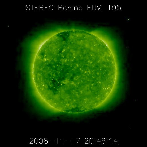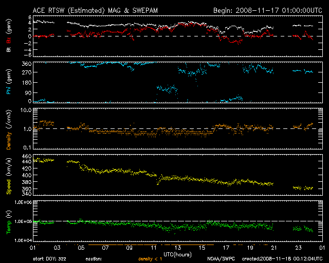 2008/11/18 09:17 更新 太陽風の速度は360km/秒に下がり、低速風に戻っています。太陽は無黒点になりました。 担当 篠原 太陽風の速度は、低下が続いています。 昨日の450km/秒から、現在は360km/秒まで下がっています。 小規模の高速風領域は終わり、地球は再び低速風領域に入っています。 磁場強度も3nTに弱まっていて、 太陽風はしばらく穏やかな状態が続くでしょう。 磁気圏活動も非常に静穏です。 AE指数、シベリア磁場データともに、全く変化が見られません。 今日の太陽コロナ写真は、STEREO Behindによるものです。 太陽の東半球(左側)に、コロナホールが広がっています。 その先頭(右端)は、太陽の中心にかかっています。 高速風到来の3日前程度と見積もることができます。 衛星の位置の関係で、STEREO Behindから見える太陽は、 地球の3日後の太陽に相当します。 これを加えると、地球での高速風の到来は、6日後の24日頃になりそうです。 27日周期の図を見てください。 前周期のグラフに、次の高速風がようやく見えて来ました。 この時は、10月28-29日に太陽風の変化が始まっています。 これを今周期に当てはめると、11月24-25日に相当します。 それまでは、基本的には、穏やかな宇宙天気が続くでしょう。 放射線帯高エネルギー電子は、大きく下がったままです。 このまま低い状態が続くでしょう。 太陽は、SOHOの新しい画像が見られないのですが、 1008黒点群が太陽の向こう側に回り、無黒点になっているようです。 STEREOの写真にも明るい領域は無く、しばらく無黒点が続くでしょう。 STEREO衛星が撮影した、太陽コロナの写真。地球よりも、3日ほど先の太陽です。18日6時(世界時17日21時)。 (c) NASA ![]() ACEが観測した太陽風の磁場(1番上の枠、白線は全体の強度、赤線は南北成分) および、太陽風の密度(3番目の橙線)、速度(4番目の黄線) (c) NOAA/SWPC ![]() リアルタイムAE指数 下段のAEグラフの値が高くなると、オーロラ活動が活発化しています。 (c) 京都大学, NICT ![]() シベリアで観測された3日間の磁場データ 右側の3分の1が、昨日のデータになります。グラフが上がったり下がったりすると、オーロラ活動が活発化しています。 (c) NICT ![]() 27日の太陽周期に合わせたデータプロット 太陽が同じ面を地球に向けていた27日前の変化から、今後を予想することができます。 (c) NICT