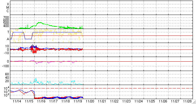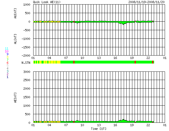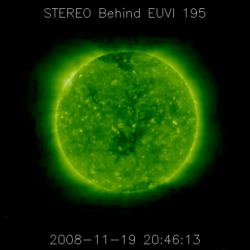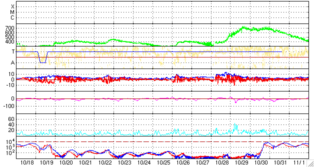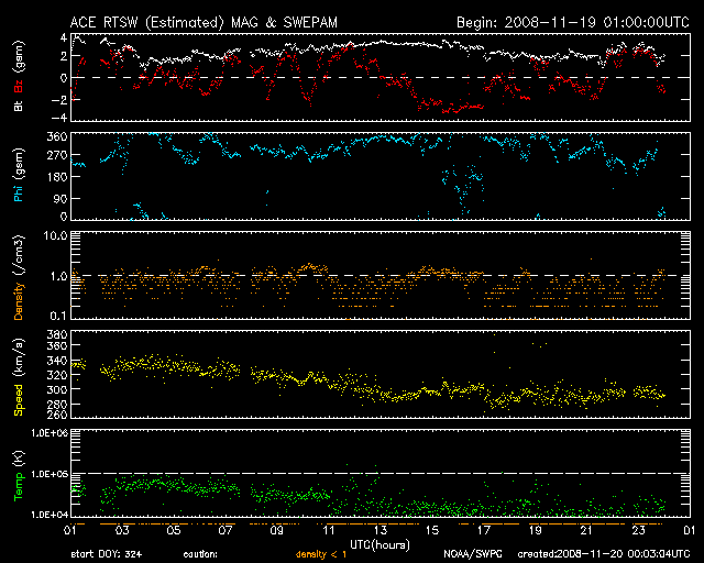 2008/11/20 09:03 更新 低速の穏やかな太陽風が続いています(300km/秒)。磁気圏の活動も静穏です。 担当 篠原 穏やかな宇宙天気が続いています。 太陽風の速度は低く、330km/秒から300km/秒へ更に下がっています。 磁場強度も3nTに弱まったままです。 磁気圏も静穏です。 AE指数、シベリア磁場データともに、ほとんど変化は見られません。 20日2時(世界時19日17時)頃に、とても小さな変化が見られますが、 これは、太陽風磁場の南北成分が、3時間ほど-3nTの南向きになったためです。 たいした変化ではありませんが、他が静かなので、目立って見えます。 STEREO Behind衛星の太陽コロナ写真では、コロナホールが太陽の中心に広がっています。 次の高速風の到来も、次第に近づいています。 24-25日頃から始まると予想されます。 太陽は無黒点で、静穏です。 昨日の朝の写真になりますが、SOHOの可視光写真を掲載します。 全く何も見えません。 STEREO behind衛星による太陽コロナ写真。地球よりも、3日ほど先の太陽です。20日6時(世界時19日21時)。 (c) NASA ![]() SOHOによる太陽の可視光写真。黒点などは見られません。19日9時(世界時19日0時) (c) SOHO (ESA & NASA) ![]() ACEが観測した太陽風の磁場(1番上の枠、白線は全体の強度、赤線は南北成分) および、太陽風の密度(3番目の橙線)、速度(4番目の黄線) (c) NOAA/SWPC ![]() リアルタイムAE指数 下段のAEグラフの値が高くなると、オーロラ活動が活発化しています。 (c) 京都大学, NICT ![]() シベリアで観測された3日間の磁場データ 右側の3分の1が、昨日のデータになります。グラフが上がったり下がったりすると、オーロラ活動が活発化しています。 (c) NICT ![]() 27日の太陽周期に合わせたデータプロット 太陽が同じ面を地球に向けていた27日前の変化から、今後を予想することができます。 (c) NICT