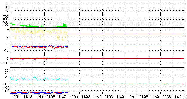 ACEが観測した太陽風の磁場(1番上の枠、白線は全体の強度、赤線は南北成分) および、太陽風の密度(3番目の橙線)、速度(4番目の黄線) (c) NOAA/SWPC ![]() リアルタイムAE指数 下段のAEグラフの値が高くなると、オーロラ活動が活発化しています。 (c) 京都大学, NICT ![]() シベリアで観測された3日間の磁場データ 右側の3分の1が、昨日のデータになります。グラフが上がったり下がったりすると、オーロラ活動が活発化しています。 (c) NICT ![]() 27日の太陽周期に合わせたデータプロット 太陽が同じ面を地球に向けていた27日前の変化から、今後を予想することができます。 (c) NICT