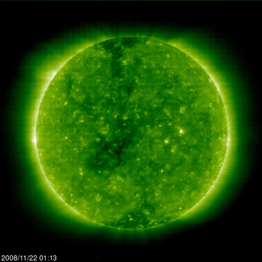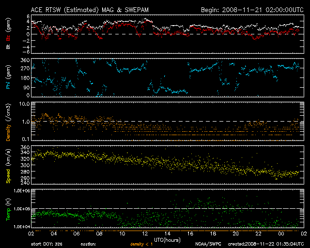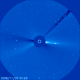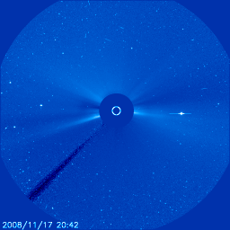 2008/11/22 10:35 更新 太陽風の速度は280km/秒とかなり低速になっています。磁気圏も静穏です。 担当 篠原 ここしばらく、SOHOの写真がほとんど更新されませんでした。 それは、SOHO衛星がアンテナに故障を抱えているので、 軌道の途中で、電波を十分に地球に送信できなくなる期間が発生するためです。 その期間は、Keyhole(鍵穴)と呼ばれています。 (英文ですが、参考資料です。軌道の図があるのでご覧下さい。) そして、その前後で衛星は、 電波を地球に効率よく送信するため、姿勢をひっくり返します。 その結果、LASCO C3カメラでは、太陽を覆うための棒の位置がひっくり返ります。 今日掲載しているLASCO C3の2枚の写真を比べてください。 11月17日と20日の間に、支え棒の位置が左下から右上に反転しています。 ある時(Keyholeを挟んでですが)、さりげなくひっくり返るので、 気づかないままということが多いのですが、 今回、水星を追いかけていて目についたので紹介します。 SOHOには、太陽風を観測する装置も積まれています。 そのデータを掲載しているページには、 太陽風を監視している犬がいます。 その犬の姿勢が、SOHO衛星の姿勢に合わせてひっくり返るのです。 ちょうど今、ひっくり返った状態です。 しばらく先になりますが、SOHOが次のKeyholeを迎え、姿勢が反転すると、 この犬も元の向きに戻ります。 お楽しみに。 また、激しい太陽風がやって来ると、この犬は急にたくましい姿に変身します。 最近はなかなか機会がないのですが、ちょっと気にかけていてください。 さて、太陽風は、速度が280km/秒を割るほどに下がり、かなり低速になっています。 プラズマの密度が薄くなっていて、データが散らばり始めています。 磁場強度も2nTと弱まっていて、とても穏やかです。 磁気圏もとても静かです。 AE指数には全く変化が見られません。 SOHO EIT195では、コロナホールが太陽の中心に達しています。 この3日後に高速風がやって来るとして、25日頃になるでしょうか。 コロナホールが縦長に変形していて、 高速風領域がどのように変化しているか注目されます。 太陽は無黒点が続いています。 なかなか増えそうで増えないですね。 SOHO EIT195による、太陽コロナの様子。22日10時(世界時22日1時)。 (c) SOHO (ESA & NASA) ![]() SOHO衛星のLASCO C3カメラの映像 (c) SOHO (ESA & NASA)
