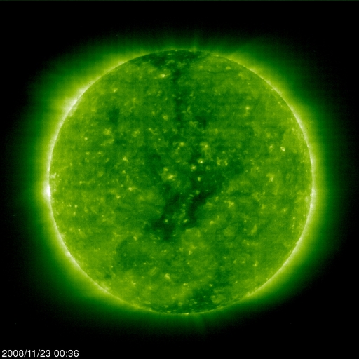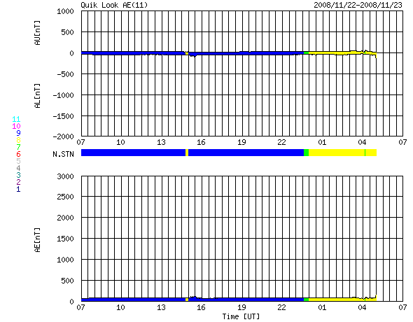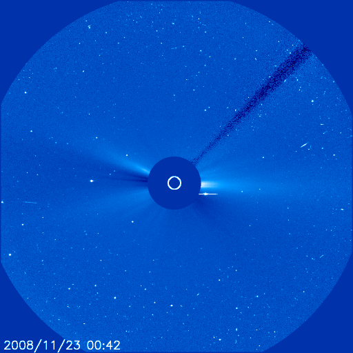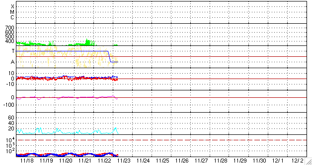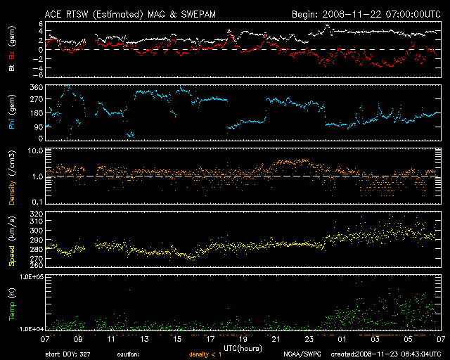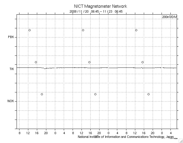 2008/11/23 15:43 更新 太陽風は290km/秒と低速で、磁気圏もとても静かです。コロナホールが太陽の中心に来ています。 担当 篠原 水星がどんどん太陽に近づいています。 SOHO LASCO C3の写真をご覧下さい。 太陽の右側すぐ近くに、水星が明るく光っています。 一方、左側に少し離れたところにやや明るく光っているのが火星です。 今後の水星は、LASCO C2で見ると良いでしょう。 低速で穏やかな太陽風が続いています。 速度に目立った変化はなく、290km/秒前後で推移しています。 磁場強度は、図の前半は2nT、後半に入って4nT近くに上がっていますが、 小さな変化です。 磁気圏もとても静かです。 AE指数、シベリア磁場データともに、全く変化していません。 明日いっぱいは、このまま穏やかな太陽風が続くでしょう。 高速風の到来は、25日くらいになると思われます。 SOHO EIT195の太陽コロナを見てください。 ちょうど今、太陽の中心にコロナホールが来ています。 このことから、3日後の26日、27日くらいに 最も勢いの良い高速風が来るのではないかと思います。 前周期の変化を見ると、高速風の始まりに先立って、 磁場強度がしっかり強まる期間があります。 今回も、同様の変化が見られるかもしれません。 それとともに、オーロラ活動が活発化すると期待されますので、 注目してください。 太陽は無黒点で静穏です。 SOHO LASCO C3カメラで、太陽の右に水星、左に火星が見えています。23日9時半(世界時23日0時半)。 (c) SOHO (ESA & NASA) ![]() SOHO EIT195による、太陽コロナの様子。23日9時半(世界時23日0時半)。 (c) SOHO (ESA & NASA) ![]() ACEが観測した太陽風の磁場(1番上の枠、白線は全体の強度、赤線は南北成分) および、太陽風の密度(3番目の橙線)、速度(4番目の黄線) (c) NOAA/SWPC ![]() リアルタイムAE指数 下段のAEグラフの値が高くなると、オーロラ活動が活発化しています。 (c) 京都大学, NICT ![]() シベリアで観測された3日間の磁場データ 右側の3分の1が、昨日のデータになります。グラフが上がったり下がったりすると、オーロラ活動が活発化しています。 (c) NICT ![]() 27日の太陽周期に合わせたデータプロット 太陽が同じ面を地球に向けていた27日前の変化から、今後を予想することができます。 (c) NICT