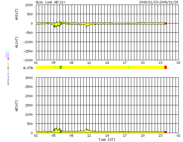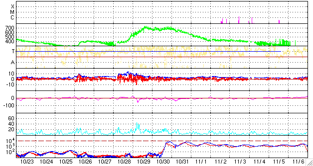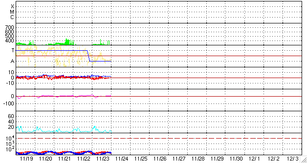 ACEが観測した太陽風の磁場(1番上の枠、白線は全体の強度、赤線は南北成分) および、太陽風の密度(3番目の橙線)、速度(4番目の黄線) (c) NOAA/SWPC ![]() リアルタイムAE指数 下段のAEグラフの値が高くなると、オーロラ活動が活発化しています。 (c) 京都大学, NICT ![]() シベリアで観測された3日間の磁場データ 右側の3分の1が、昨日のデータになります。グラフが上がったり下がったりすると、オーロラ活動が活発化しています。 (c) NICT ![]() 27日の太陽周期に合わせたデータプロット 太陽が同じ面を地球に向けていた27日前の変化から、今後を予想することができます。 (c) NICT