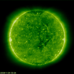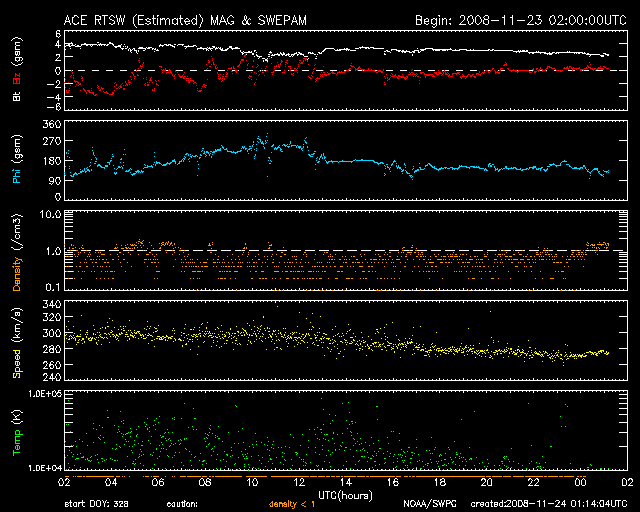 2008/11/24 10:14 更新 太陽風は、280km/秒と低速で、磁気圏も穏やかです。今後、高速太陽風の回帰が始まります。 担当 篠原 昨日より、太陽風の速度は280km/秒でほぼ安定しています。 かなり速度の遅い太陽風が続いています。 磁場強度は、4nTから2nTへ弱まっています。 太陽風は、非常に穏やかです。 磁気圏も静穏です。 AE指数には、200nTくらいの小さな変化が見られますが、 これは、太陽風の磁場が-3nTほどの南向きになっていた影響です。 南向きと言っても、たいした振幅ではなく、 速度もかなり低いため、磁気圏で起きた活動も小さなものとなっています。 高速太陽風の到来が近づいています。 27日周期の図を見てください。 前周期の高速風の到来は、10月29日でした。 これは、明日、11月25日に相当します。 しかし、その前日の10月28日には、磁場強度が大きく強まり、 太陽風の変化は既に始まっています。 これは、今日11月24日に相当します。 今日の午後くらいから、太陽風に変化が現れる可能性があります。 その一方、SOHO EIT195で見えるコロナホールは、様子がかなり変わっています。 掲載している2枚の写真を比べてください。 前周期(右)は、コロナホールがしっかりと濃く見えているのに対し、 今周期(左)は、全体的に淡くなり、広がりも小さくなっています。 この影響で、これから回帰する高速風の様子も変化している可能性があります。 また、27日周期の図のセクターのグラフを見てください。 掲載の期間中、前周期はずっとT(太陽風磁場が地球から太陽向き)だったのに対し、 今周期は、昨日からA(太陽から地球向き)に変わっています。 この変化も、今後の太陽風の変化のきざしなのかもしれません。 今日以降の、太陽風の磁場と速度の変化に注目してください。 放射線帯高エネルギー電子は、たいへん低いレベルで安定しています。 高速風到来以降、注意が必要です。 太陽は無黒点で、静穏です。 SOHO衛星のEIT195カメラの映像 (c) SOHO (ESA & NASA)