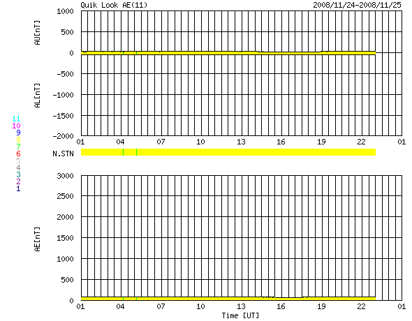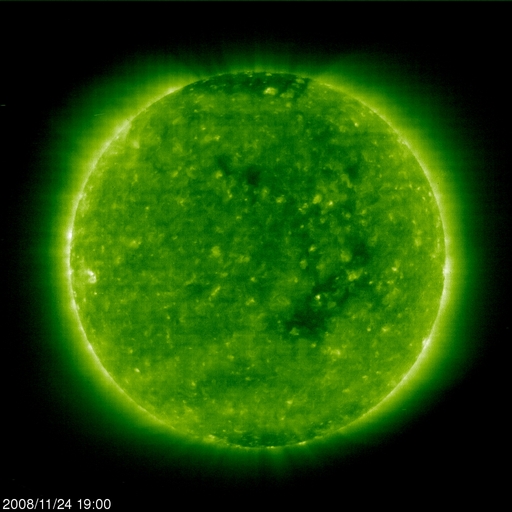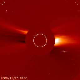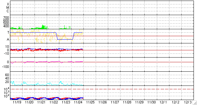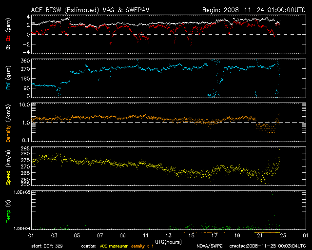 2008/11/25 09:03 更新 太陽風の速度は270km/秒に下がり、かなり低速です。高速風の到来が近づいています。 担当 篠原 水星が太陽に接近しています。 SOHO LASCO C2の動画で、近づいて行く様子をご覧下さい。 もうすぐ、LASCO C2カメラの遮光板に隠れてしまいそうです。 また、カメラは小規模のCME(太陽ガスの放出現象)もとらえています。 太陽風の速度は、270km/秒で推移しています。 昨日よりも下がっていて、かなり遅い太陽風です。 磁場強度も、2-3nTと弱まったままで、高速風の気配はまだ見えません。 磁気圏もたいへん静かです。 AE指数、シベリア磁場データともに平坦なままです。 SOHO EIT 195を見ると、コロナホールは西側(右側)半分の辺りまで移動していて、 いつ高速風が到来してもいい頃です。 今後の太陽風の変化に注目してください。 初めに、磁場強度とプラズマ密度が強まり始めます。 そして、速度が増加を始めるでしょう。 磁場強度が強まると、南向きになった時に活発なオーロラ活動を起こします。 今日から2-3日程度、極域ではオーロラ活動が期待できます。 現在の放射線帯高エネルギー電子は、たいへん低い状態です。 高速風到来後、増加が見込まれるので、明日以降の変化に注目してください。 太陽は無黒点で、活動はとても穏やかです。 水星が太陽に接近しています。SOHO LASCO C2。 (c) SOHO (ESA & NASA) ![]() SOHO EIT195による、太陽コロナの様子。25日4時(世界時24日19時)。 (c) SOHO (ESA & NASA) ![]() ACEが観測した太陽風の磁場(1番上の枠、白線は全体の強度、赤線は南北成分) および、太陽風の密度(3番目の橙線)、速度(4番目の黄線) (c) NOAA/SWPC ![]() リアルタイムAE指数 下段のAEグラフの値が高くなると、オーロラ活動が活発化しています。 (c) 京都大学, NICT ![]() シベリアで観測された3日間の磁場データ 右側の3分の1が、昨日のデータになります。グラフが上がったり下がったりすると、オーロラ活動が活発化しています。 (c) NICT ![]() 27日の太陽周期に合わせたデータプロット 太陽が同じ面を地球に向けていた27日前の変化から、今後を予想することができます。 (c) NICT