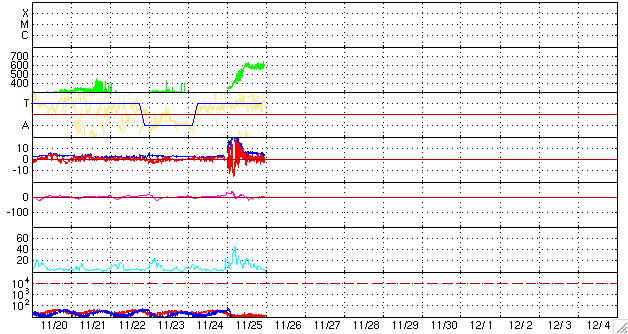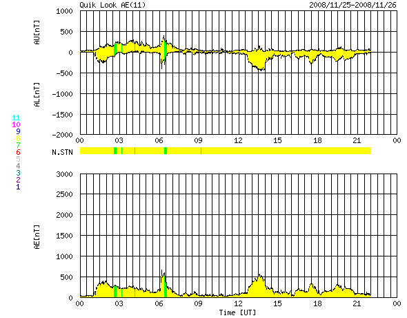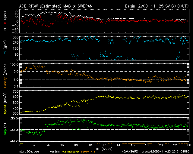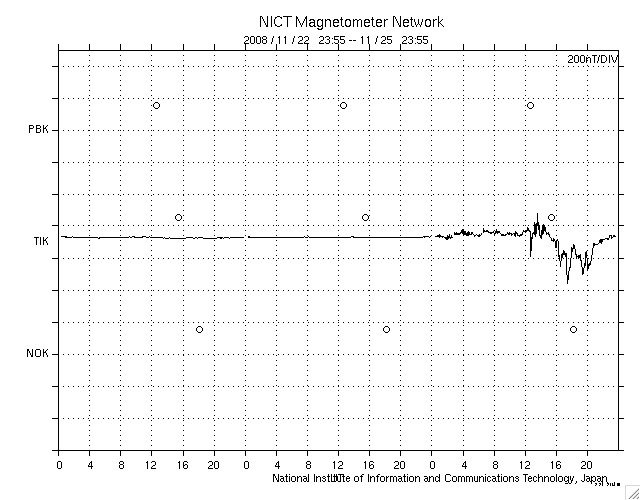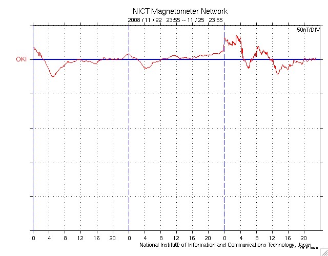 2008/11/26 08:51 更新 高速太陽風が始まりました。速度は600km/秒に上昇しています。オーロラ活動もある程度発生しています。 担当 篠原 高速の太陽風が、一気に始まりました。 昨日のニュースの直後から、太陽風磁場(ACEの白線)は強まり始め、 それまでの3nTから、6時間ほどで20nTを超えるほどになりました。 磁場とともに、プラズマの密度(橙色線)も大きく増加しています。 こちらは、1個/cm^3から、40個/cm^3へと増加しています。 これらの変化による地上磁場の増加現象が、沖縄で観測されています。 沖縄の磁場データを見てください。 25日9時(世界時25日0時)に、20nTほどの急な増加が観測されています。 これは、太陽風の圧力が強まった(密度の増加による)ことで、 磁気圏が急に押しつぶされて発生した変化です。 磁気圏全体が圧縮されるため、この変化は沖縄に限らず、 世界各地で観測されています。 磁場強度が強まりきった25日12時(世界時25日3時)頃から、 太陽風の速度(ACEの黄色線)も上昇を始めました。 300km/ほどだった速度は、8時間ほどで600km/秒に上昇し、 一気に高速風が始まりました。 27日周期の図で、前周期の変化と比較してください。 磁場の強まりが非常に大きく、速度も短時間で大きく上昇しています。 この変化による磁気圏活動への影響は、それほど大きくなっていません。 AE指数では、500nTほどの小さめの中規模活動が断続的に発生している程度です。 その原因は、太陽風磁場の南北成分が、概ね北寄りで推移しているためです。 ACEの図に戻ると、磁場の南北成分(赤線)は、 最初の部分で-10nTを超えるほどの南向きを示していますが、 以降、北寄りに転じ、その後もほぼ0nTか、プラス側に偏っています。 速度が上がっても、磁気圏活動があまり強まっていないのはこのためです。 27日周期の図より見積もると、 高速太陽風は、これから3-4日程度続くと予想されます。 現在も磁場強度は5nTほどありますので、速度はもう少し上昇するかもしれません。 明日くらいまでは、磁気圏活動もある程度活発に続きそうです。 速度が高まっている間は、 磁場の傾向が南寄りになると、一気に活動度も増します。 注目してください。 放射線帯高エネルギー電子は、現在は低いレベルに留まっています。 今後、増加が始まると予想されますので、注意してください。 太陽は無黒点が続いています。 活動は静かです。 SOHO EIT195による、太陽コロナの様子。26日1時半(世界時25日16時半)。 (c) SOHO (ESA & NASA) ![]() ACEが観測した太陽風の磁場(1番上の枠、白線は全体の強度、赤線は南北成分) および、太陽風の密度(3番目の橙線)、速度(4番目の黄線) (c) NOAA/SWPC ![]() 沖縄の磁場擾乱 下へ下がるほど、擾乱が発達している事を意味します。 (c) NICT ![]() リアルタイムAE指数 下段のAEグラフの値が高くなると、オーロラ活動が活発化しています。 (c) 京都大学, NICT ![]() シベリアで観測された3日間の磁場データ 右側の3分の1が、昨日のデータになります。グラフが上がったり下がったりすると、オーロラ活動が活発化しています。 (c) NICT ![]() 27日の太陽周期に合わせたデータプロット 太陽が同じ面を地球に向けていた27日前の変化から、今後を予想することができます。 (c) NICT
