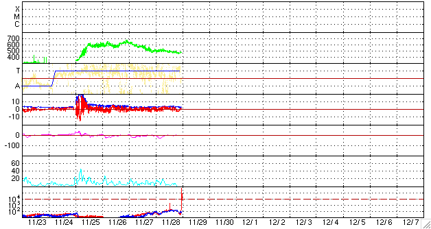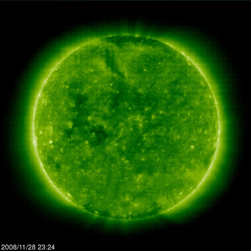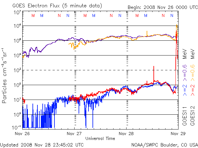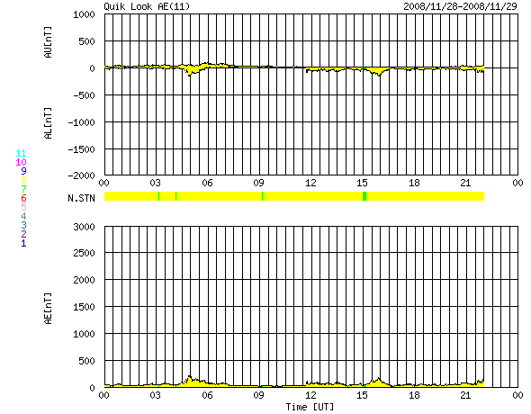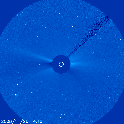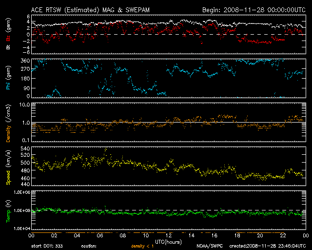 2008/11/29 08:46 更新 太陽風の速度はゆっくりと下げています。磁気圏も静穏です。 担当 篠原 SOHO衛星のLASCO C3カメラの視野に、水星と火星が見えています。 明るく光る水星は、太陽の近くを通り過ぎ、東側(左側)に現れました。 そして、やや暗く見える火星に接近しています。 この写真の背景は、さそり座です。 さそり座といえば、夏の星座の代表です。 SOHOは太陽の方向を向いているので、見える星は季節が逆転するのです。 明るい星は、「火星の敵」と言われる赤い一等星、アンタレスです。 また、そのすぐ横に、球状星団のM4が見えています。 やがて、LASCO C3では、夏の天の川が見える様になります。 最新データで宇宙天気を考えつつ、季節感もどうぞ味わってください。 さて、太陽風はゆっくりと速度を下げています。 昨日は一段落だったのか、500km/秒から470km/秒へ下げた程度で、 それほど大きな変化ではありませんでした。 この速度も、今日いっぱいで、 明日には、400km/秒付近へ下がっているのではないかと思います。 磁気圏活動も小さくなっていて、AE指数などオーロラ活動は穏やかです。 静穏な状態は、これから5日程度続くと思われます。 SOHO EIT195を見てください。 コロナホールが、太陽の東側に淡く広がっています。 先頭がこれから太陽の中心に達するところです。 だいぶ見えて来たので、明日にでも前周期の広がりと比較してみましょう。 放射線帯高エネルギー電子は、やや強まっているものの、 目立った変化にはなりませんでした。 今後も、このまま低い状態が続くでしょう。 太陽は無黒点で、静穏です。 黒点の無い状態が、また続いています。 水星と火星が太陽に近づいています。背景はさそり座です(SOHO LASCO C3カメラ)。 (c) SOHO (ESA & NASA) ![]() SOHO EIT195による、太陽コロナの様子。29日8時半(世界時28日23時半)。 (c) SOHO (ESA & NASA) ![]() ACEが観測した太陽風の磁場(1番上の枠、白線は全体の強度、赤線は南北成分) および、太陽風の密度(3番目の橙線)、速度(4番目の黄線) (c) NOAA/SWPC ![]() リアルタイムAE指数 下段のAEグラフの値が高くなると、オーロラ活動が活発化しています。 (c) 京都大学, NICT ![]() シベリアで観測された3日間の磁場データ 右側の3分の1が、昨日のデータになります。グラフが上がったり下がったりすると、オーロラ活動が活発化しています。 (c) NICT ![]() 27日の太陽周期に合わせたデータプロット 太陽が同じ面を地球に向けていた27日前の変化から、今後を予想することができます。 (c) NICT