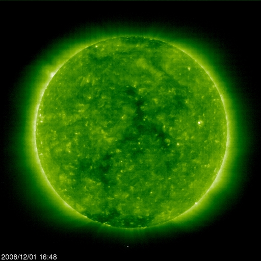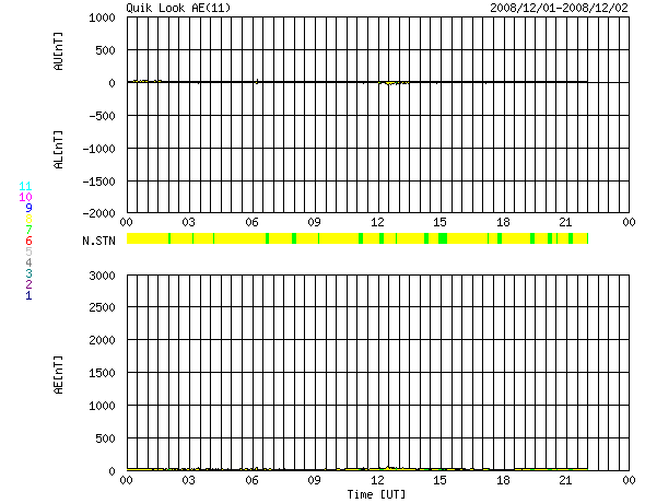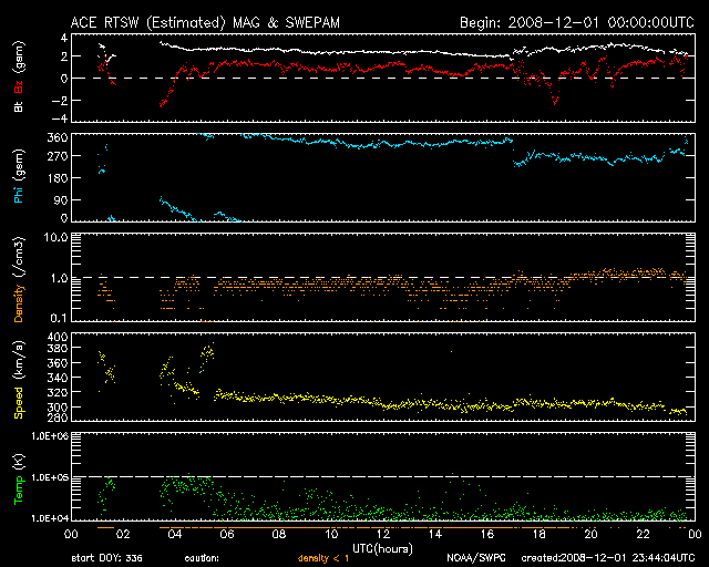 2008/12/ 2 08:45 更新 太陽風の速度は300km/秒に下がり、磁気圏も非常に静穏です。無黒点も続いています。 担当 篠原 太陽風の速度は、もう一段下がり、300km/秒となっています。 かなり低速の状態です。 27日周期の図を見ると、前周期もこの頃は300km/秒を割るほどの低速風になっていました。 また、太陽風の磁場強度も3nTに弱まったままです。 磁気圏活動も非常に静穏です。 AE指数には、全く変化がなく、 シベリア磁場データも3日間にわたって、まっすぐな線になっています。 その一方、高速太陽風が近づいています。 SOHO EIT195では、コロナホールが太陽の中心に広がり、 先頭(右端)は、既に西半球(右半分)にせり出しています。 27日周期の図の予想では、高速風の回帰は4日頃と予想されます。 それまでは、速度の遅い穏やかな状態が続くでしょう。 太陽は無黒点です。 こちらも非常に静穏です。 SOHO EIT195による、太陽コロナの様子。2日1時半(世界時1日16時半)。 (c) SOHO (ESA & NASA) ![]() ACEが観測した太陽風の磁場(1番上の枠、白線は全体の強度、赤線は南北成分) および、太陽風の密度(3番目の橙線)、速度(4番目の黄線) (c) NOAA/SWPC ![]() リアルタイムAE指数 下段のAEグラフの値が高くなると、オーロラ活動が活発化しています。 (c) 京都大学, NICT ![]() シベリアで観測された3日間の磁場データ 右側の3分の1が、昨日のデータになります。グラフが上がったり下がったりすると、オーロラ活動が活発化しています。 (c) NICT ![]() 27日の太陽周期に合わせたデータプロット 太陽が同じ面を地球に向けていた27日前の変化から、今後を予想することができます。 (c) NICT