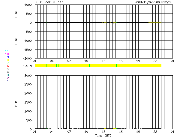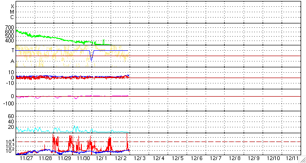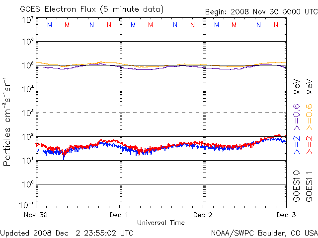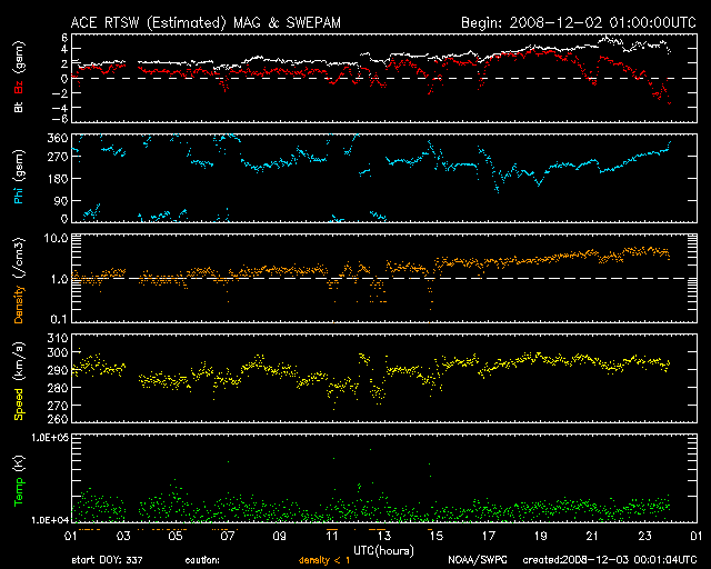2008/12/ 3 09:02 更新 290km/秒と速度の遅い太陽風が続いています。一方、高速風の到来も近づいています。 担当 篠原 穏やかな太陽風が続いています。 速度はかなり遅く、290km/秒でほぼ安定しています。 磁場強度は、初め2nTとかなり弱かったのですが、 次第に上昇し、現在は5nTと通常の強さを回復しています。 明日くらいに、高速太陽風が始まると予想していますが、 それに繋がる変化かもしれません。 引き続き磁場強度が上昇する様だと、高速風の始まりも近いと考えられます。 現在の磁気圏は、非常に静穏です。 AE指数は全く変化していません。 27日周期の図を見ると、前周期、11月7日に始まった高速風の回帰が近づいています。 今日から明日にかけて、注目してください。 前周期は、最高速度が600km/秒、高速風は3日ほど続きました。 高速風の前半では、磁場強度が大きく強まりましたので、 この期間に活発なオーロラ活動が期待できます。 今夜くらいから、アラスカのライブカメラなどに注目するとよいでしょう。 (最近、更新が停止していることが多いのですが) GOESの放射線帯高エネルギー電子のグラフが、正常に戻っています。 過去のデータもきれいになっていますが、何が原因だったのでしょうか。 太陽は無黒点で、静穏です。 ACEが観測した太陽風の磁場(1番上の枠、白線は全体の強度、赤線は南北成分) および、太陽風の密度(3番目の橙線)、速度(4番目の黄線) (c) NOAA/SWPC ![]() リアルタイムAE指数 下段のAEグラフの値が高くなると、オーロラ活動が活発化しています。 (c) 京都大学, NICT ![]() シベリアで観測された3日間の磁場データ 右側の3分の1が、昨日のデータになります。グラフが上がったり下がったりすると、オーロラ活動が活発化しています。 (c) NICT ![]() 27日の太陽周期に合わせたデータプロット 太陽が同じ面を地球に向けていた27日前の変化から、今後を予想することができます。 (c) NICT