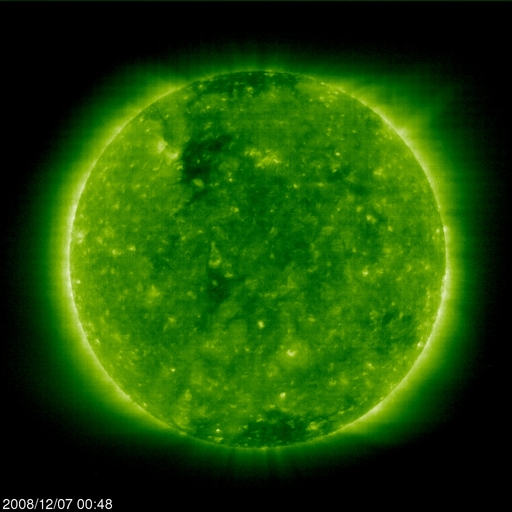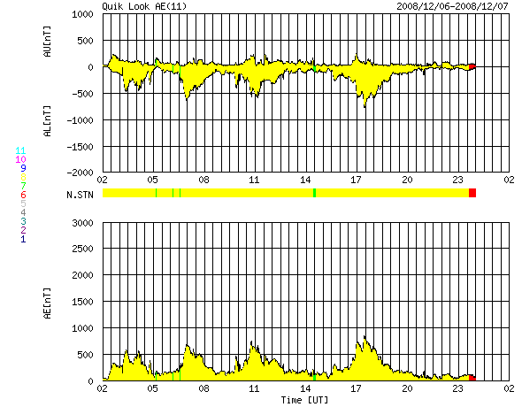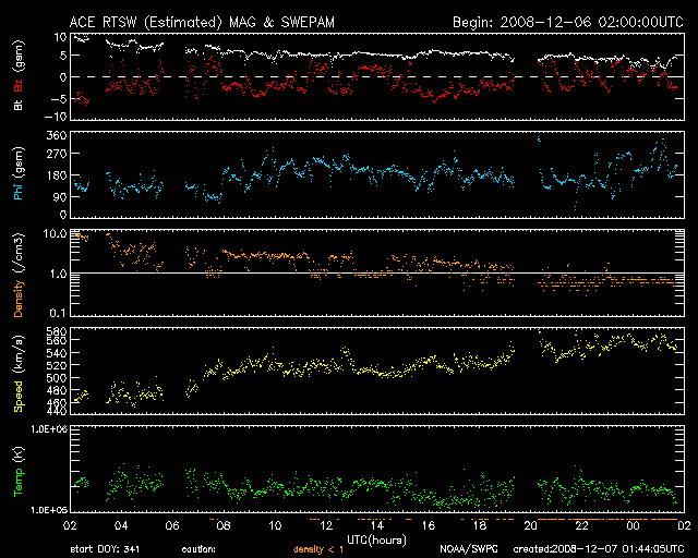 2008/12/ 7 10:42 更新 太陽風の速度は550km/秒に上昇し、再び高速状態になっています。磁気圏も活動的です。 担当 篠原 太陽風は、再び高速風に変わっています。 昨日のニュースの後、速度はゆっくりと上昇を続け、 450km/秒から550km/秒へ上がりました。 一方、10nTに強まっていた磁場強度は、低下して3nTに弱まっています。 このため、速度の上昇はこのあたりで止まると思われます。 27日周期の図で、高速風の分布を見てください。 前周期までは、ひとつのかたまりになっていた高速風(11月7〜9日)は、 前後、2つのグループに分かれつつある様です(12月4日と12月6日付近)。 期間全体に渡って磁場強度が強まっている点も興味深く、 次の周期にどのように変わっているか注目されます。 太陽風磁場の南北成分は、南寄りの傾向が続いていました。 このため、AE指数では500〜800nTの中規模変動が数時間おきに発生しています。 極域では、活発なオーロラ活動が見られていたようです。 その様子は、シベリア磁場データでも見ることができます。 この図は、一つの観測点の変化なので、オーロラの活動が見えやすい時間帯があり、 毎日、同じ時間帯に目立った変化が見えています(この図は3日幅です)。 再び速度の上がった太陽風ですが、高速風はそれほど長く続かないと思われます。 速度の上昇はこの辺りで止まり、安定した状態も今日いっぱいくらいではないでしょうか。 明日には、速度は低下に向かっているのではないかと思われます。 SOHO EIT195では、次のコロナホールが見えています。 太陽の中心に淡く小さな領域と、北極寄りに小さいながら濃く見えている領域があります。 どちらも、以前にSTEREO Behindの画像で紹介したものです。 明日にでも、太陽の中心に達しそうです。 もう少し見えやすくなるでしょうか。 放射線帯高エネルギー電子は、一気に増加しています。 といっても、前のレベルが低過ぎたのか、数千に上がった程度です。 警戒レベルに達するかどうか、引き続き注目してください。 太陽は無黒点で、静穏です。 SOHO EIT195による、太陽コロナの様子。7日10時(世界時7日1時)。 (c) SOHO (ESA & NASA) ![]() ACEが観測した太陽風の磁場(1番上の枠、白線は全体の強度、赤線は南北成分) および、太陽風の密度(3番目の橙線)、速度(4番目の黄線) (c) NOAA/SWPC ![]() リアルタイムAE指数 下段のAEグラフの値が高くなると、オーロラ活動が活発化しています。 (c) 京都大学, NICT ![]() シベリアで観測された3日間の磁場データ 右側の3分の1が、昨日のデータになります。グラフが上がったり下がったりすると、オーロラ活動が活発化しています。 (c) NICT ![]() 27日の太陽周期に合わせたデータプロット 太陽が同じ面を地球に向けていた27日前の変化から、今後を予想することができます。 (c) NICT