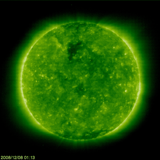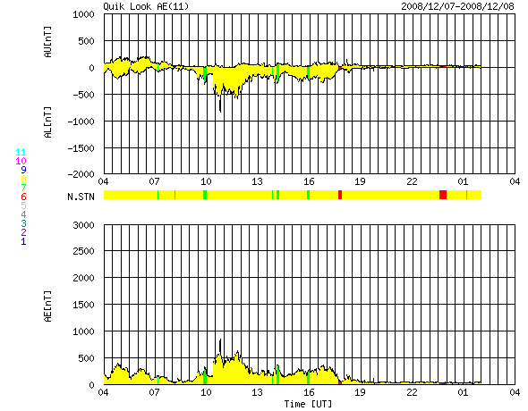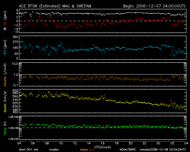 2008/12/ 8 12:54 更新 太陽風速度の低下が始まり、高速風は終わりつつあります(500km/秒)。 担当 篠原 高速の太陽風は、昨日の夕方頃まで550km/秒を保ち、 その後、ゆっくりと低下を始めています。 現在の速度は、500km/秒です。 今後も速度は低下を続け、 明日には高速風は終わっているのではないでしょうか。 磁気圏活動は、続いていますが、規模は小さくなっています。 AE指数では、300〜500nTの小規模の変化が見られています。 速度はある程度上がったものの、 磁場強度が弱まったことで、南向きの成分も小さくなってしまったことが 効いているのだと思います。 現在は、速度が低下に向かい、磁場強度も3nTヘ更に弱まりつつありますので、 磁気圏活動は更に静かになるでしょう。 SOHO EIT195の太陽コロナを見ると、 北半球の緯度の高い領域に、小さくまとまったコロナホールが見えます。 太陽の中心にも、コロナホールがあるようなのですが、 かなり淡く、はっきりしません。 STEREOの写真で紹介した時は、もう少し見やすかったのですが、 弱まっているのでしょうか。 これらのコロナホールの影響がどうなるのか、今週の後半に注目してください。 27日周期の図で前周期を振り返ると、11月16日に弱い高速風が来ていました。 単純に回帰を見積もると、12月13日頃になります。 放射線帯高エネルギー電子は、1000ほどまでの増加で止まっています。 今回は、これ以上大きく増えることはなさそうです。 太陽は無黒点が続いています。 SOHO EIT194では、明るく光る領域も見られません。 SOHO EIT195による、太陽コロナの様子。8日10時(世界時8日1時)。 (c) SOHO (ESA & NASA) ![]() ACEが観測した太陽風の磁場(1番上の枠、白線は全体の強度、赤線は南北成分) および、太陽風の密度(3番目の橙線)、速度(4番目の黄線) (c) NOAA/SWPC ![]() リアルタイムAE指数 下段のAEグラフの値が高くなると、オーロラ活動が活発化しています。 (c) 京都大学, NICT ![]() シベリアで観測された3日間の磁場データ 右側の3分の1が、昨日のデータになります。グラフが上がったり下がったりすると、オーロラ活動が活発化しています。 (c) NICT ![]() 27日の太陽周期に合わせたデータプロット 太陽が同じ面を地球に向けていた27日前の変化から、今後を予想することができます。 (c) NICT