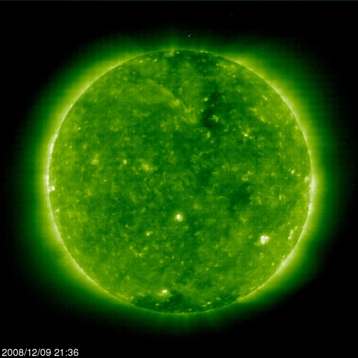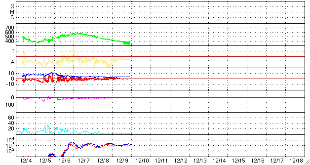 2008/12/10 09:23 更新 太陽風は低速になり、磁気圏は静穏です。太陽に磁場の強まりが見えています。 担当 篠原 太陽に、新しい第24活動周期の磁場の強まりが現れています。 1枚目のSOHOの磁場写真を見てください。 南西(右下)の端近くに、[ 黒 白 ]と並んだ磁場の強まりが見えています。 半日ほどの間に急に出現した領域ですが、 この磁場の順番は、南半球の第24期の性質です。 この後、更に発達して黒点が出現するかもしれません。 一方、北半球の北極近くに目を向けると、 とても淡くですが、[ 白 黒 ]とならぶ磁場の分布が見えます。 こちらは、第24期の北半球側の性質です。 北半球と南半球とで、磁場の分布が逆を向くことが、この写真から見ることができます。 太陽自体は、依然無黒点で、静穏です。 太陽風は速度が更に下がり、350km/秒ほどの低速風になっています。 プラズマの密度が0.1個/cm^3近くにまで下がっているため、 速度データは、散らばりが激しくなっています。 穏やかな太陽風のため、磁気圏もとても静穏です。 今日から明日くらいまで、太陽風、磁気圏ともに穏やかな状態が続くと予想されます。 12日以降は、前周期に見られた小規模の太陽風の乱れの回帰があるでしょう。 SOHO EIT195では、淡いコロナホールが太陽の西半球に移動し、 地球への影響開始位置に近づいています。 放射線帯高エネルギー電子は、1000ほどのレベルで安定しています。 SOHOによる太陽の可視光写真。南半球に、第24期の磁場の強まりが見えます。10日6時半(世界時9日21時半) (c) SOHO (ESA & NASA) ![]() SOHO EIT195による、太陽コロナの様子。10日6時半(世界時9日21時半)。 (c) SOHO (ESA & NASA) ![]() SOHO衛星のMDIカメラによる太陽黒点 (c) SOHO (ESA & NASA) ![]() GOES衛星の太陽X線データ (c) NOAA/SWPC ![]() ACEが観測した太陽風の磁場(1番上の枠、白線は全体の強度、赤線は南北成分) および、太陽風の密度(3番目の橙線)、速度(4番目の黄線) (c) NOAA/SWPC ![]() リアルタイムAE指数 下段のAEグラフの値が高くなると、オーロラ活動が活発化しています。 (c) 京都大学, NICT ![]() シベリアで観測された3日間の磁場データ 右側の3分の1が、昨日のデータになります。グラフが上がったり下がったりすると、オーロラ活動が活発化しています。 (c) NICT ![]() 27日の太陽周期に合わせたデータプロット 太陽が同じ面を地球に向けていた27日前の変化から、今後を予想することができます。 (c) NICT
