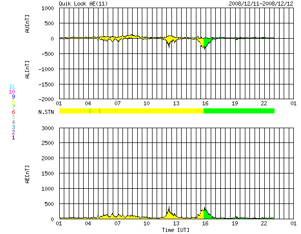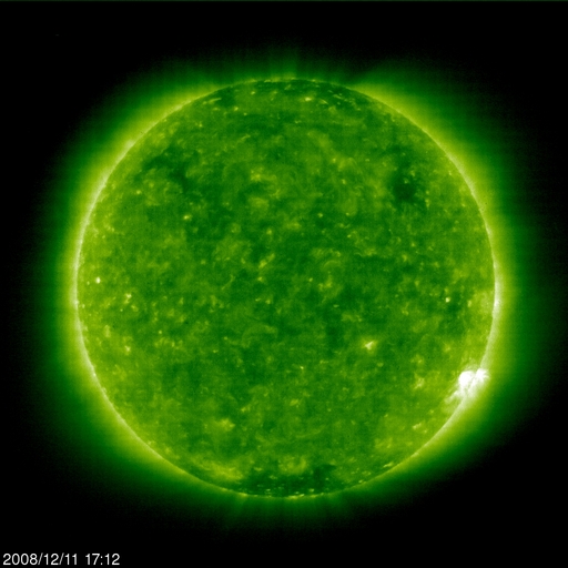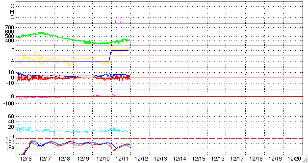 2008/12/12 09:28 更新 C1.4の小規模フレアが発生しました。太陽風は通常の速度に上がっています。 担当 篠原 太陽の南西端(右下)に出現した1009黒点群は、 その後、フレア活動を起こす様になりました。 そして、11日18時半(世界時11日9時半)にC1.4の小規模フレアが発生しました。 また、11日20時半(世界時11日11時半)には、B9.6の小さなフレアが起きています。 Cクラスのフレアは、11月3日以来、40日ぶりです。 前回は、北半球の第24期黒点初のCクラスフレアでしたが、 それに続いて、南半球における第24期黒点初のCクラスフレアとなりました。 フレアの継続時間が短かったため、 GOESのX線グラフでは、フレアはCクラスの線に達していません。 最も高く見えている山は、本当はC1.4のフレアです。 強まったフレア活動は、半日ほどで落ち着き、 現在は、小さな変化に留まっています。 SOHOの可視光写真を見ると、黒点群は昨日と大きな変化はなく、 発達は止まっていると見られます。 引き続き、Cクラスのフレアが発生する可能性があるという程度でしょう。 太陽風は、磁場強度が5nTをやや超えるレベルに高まっていましたが、 それに合わせて、速度が若干上昇し、400km/秒と通常の速度レベルを回復しています。 今日から明日にかけて、小規模の高速風が回帰して来ると予想していますが、 この後、太陽風はどのように変化するでしょうか。 引き続き、磁場強度、速度に注目してください。 太陽風の変化が小さかったため、現在の磁気圏活動は、概ね静穏です。 これから、高速風の回帰とともに、ある程度活発化する可能性があります。 SOHOによる太陽の可視光写真。右下に1009黒点群が見えています。12日1時(世界時11日16時) (c) SOHO (ESA & NASA) ![]() SOHO EIT195による、太陽コロナの様子。12日2時(世界時11日17時)。 (c) SOHO (ESA & NASA) ![]() GOES衛星の太陽X線データ (c) NOAA/SWPC ![]() ACEが観測した太陽風の磁場(1番上の枠、白線は全体の強度、赤線は南北成分) および、太陽風の密度(3番目の橙線)、速度(4番目の黄線) (c) NOAA/SWPC ![]() リアルタイムAE指数 下段のAEグラフの値が高くなると、オーロラ活動が活発化しています。 (c) 京都大学, NICT ![]() シベリアで観測された3日間の磁場データ 右側の3分の1が、昨日のデータになります。グラフが上がったり下がったりすると、オーロラ活動が活発化しています。 (c) NICT ![]() 27日の太陽周期に合わせたデータプロット 太陽が同じ面を地球に向けていた27日前の変化から、今後を予想することができます。 (c) NICT