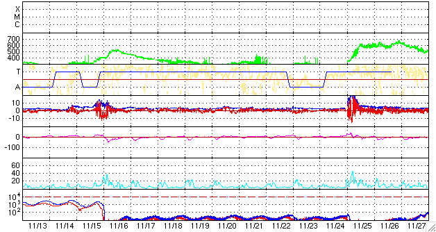 右側の3分の1が、昨日のデータになります。グラフが上がったり下がったりすると、オーロラ活動が活発化しています。