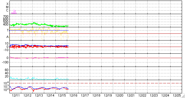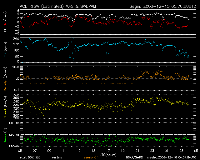 - 2008/12/15 12:43 太陽風の速度は340km/秒に下がり、低速風に戻っています。1週間ほど静穏かもしれません。