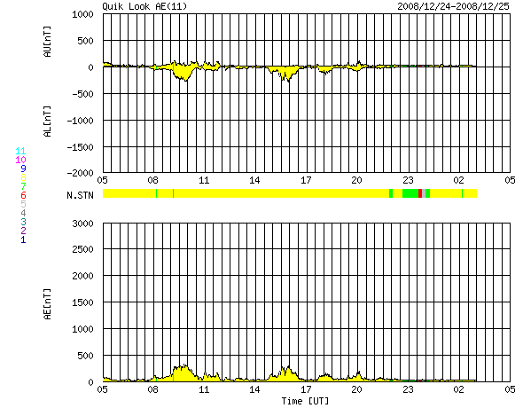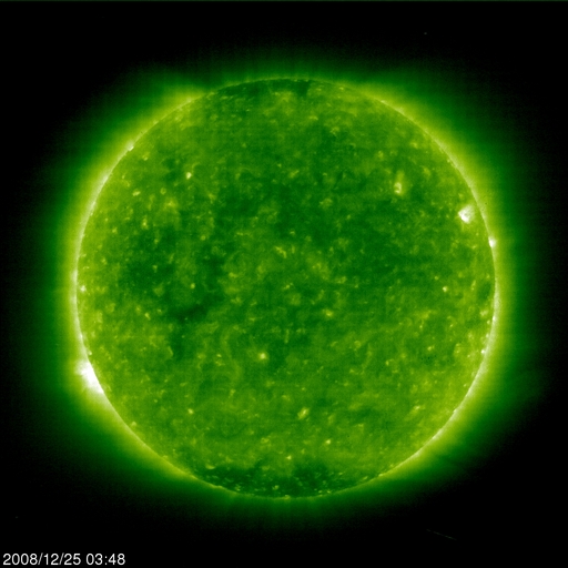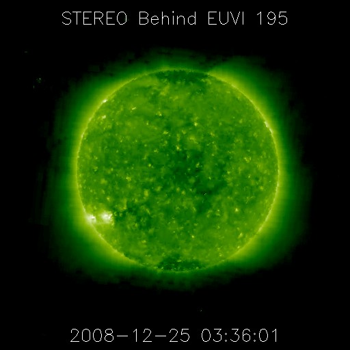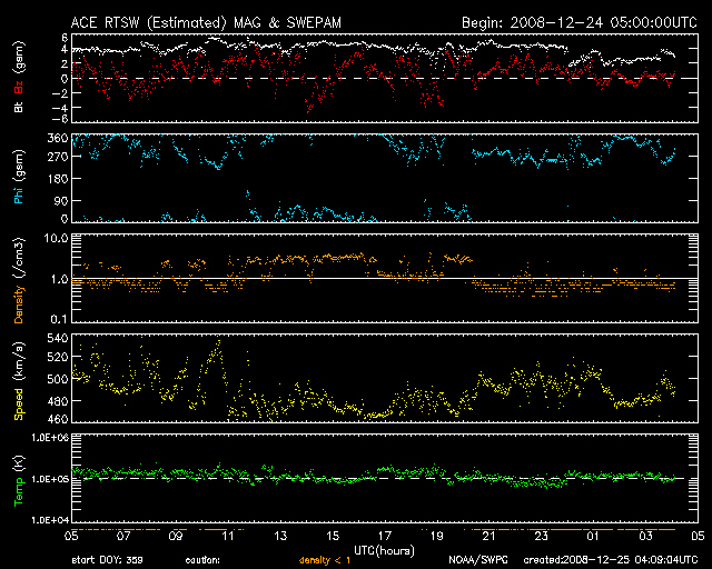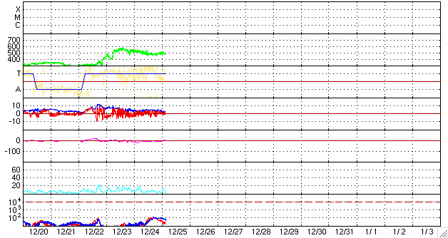 2008/12/25 13:10 更新 高速風は500km/秒を割り、後半に入っています。太陽の東から新しい黒点が現れるかもしれません。 担当 篠原 高速の太陽風が続いています。 速度はやや下がり、480〜500km/秒を推移しています。 磁場強度は、ずっと4nTを保っていましたが、掲載の図の最後で2nT近くに下がっています。 磁場強度が弱まり始め、高速風は終わりに近づいていると思われます。 磁気圏活動は小規模です。 AE指数では、300nTくらいの小さな山が2, 3見えている程度です。 高速風は、今日から明日にかけて終わりを迎えそうです。 その後、太陽風は一旦穏やかになり、年末頃に次の乱れを迎えるでしょう。 太陽は、無黒点で静穏です。 SOHO EIT195の太陽コロナ写真(掲載1枚目)では、 東端(左端)の向こう側に明るく光る領域が見えます。 STEREO Behind衛星で先回りをすると(掲載の2枚目の写真)、 ここには明るく光る2つの領域があることが分かります。 この規模だと、黒点を伴っている可能性があります。 こちら側に回ってくるのを待ちましょう。 SOHO EIT195による、太陽コロナの様子。25日13時(世界時25日4時)。 (c) SOHO (ESA & NASA) ![]() STEREO behind衛星による太陽コロナ写真。地球よりも3日ほど先の見え方です。25日12時半(世界時25日3時半) (c) NASA ![]() ACEが観測した太陽風の磁場(1番上の枠、白線は全体の強度、赤線は南北成分) および、太陽風の密度(3番目の橙線)、速度(4番目の黄線) (c) NOAA/SWPC ![]() リアルタイムAE指数 下段のAEグラフの値が高くなると、オーロラ活動が活発化しています。 (c) 京都大学, NICT ![]() シベリアで観測された3日間の磁場データ 右側の3分の1が、昨日のデータになります。グラフが上がったり下がったりすると、オーロラ活動が活発化しています。 (c) NICT ![]() 27日の太陽周期に合わせたデータプロット 太陽が同じ面を地球に向けていた27日前の変化から、今後を予想することができます。 (c) NICT