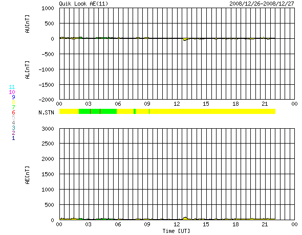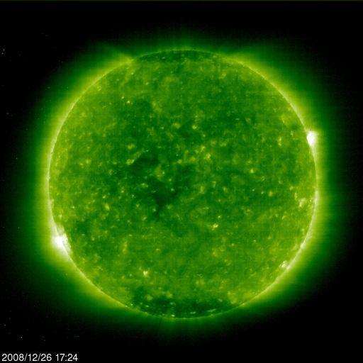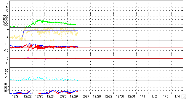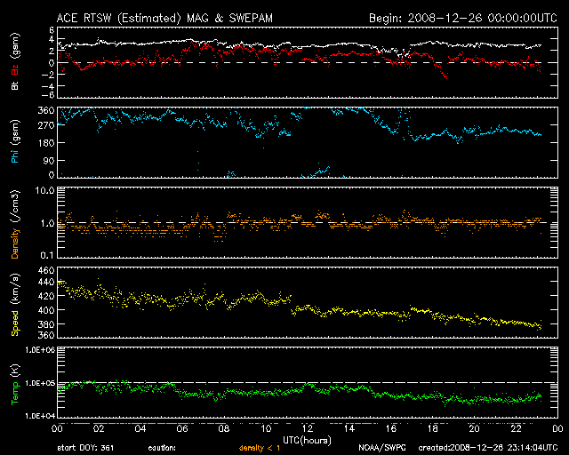 2008/12/27 08:15 更新 太陽風の速度は引き続き低下し、低速風に変わりつつあります。太陽は無黒点が続いています。 担当 篠原 太陽風の速度はゆっくりと下がり、400km/秒を割って、380km/秒になりました。 次第に低速風になりつつあります。 磁場強度も3nTと弱めで、穏やかな太陽風です。 磁気圏活動もとても穏やかです。 AE指数には、ほとんど変化がありません。 この静かな状態は、これから3-4日続くと思われます。 SOHO EIT195では、コロナホールが太陽の中心線に到達しています。 コロナホールは、太陽の中央付近で、丸くまとまった形をしています。 ちょうど年末から年始にかけて、高速風を地球にもたらしそうです。 SOHO EIT195では、太陽の東端から明るい領域が上がりつつあります。 可視光写真では、今のところ、黒点は見えません。 まだ、端近くですし、もう少し様子を見ましょう。 STEREO bihindの写真によると、明るい領域はもうひとつ上がって来ます。 SOHO EIT195による、太陽コロナの様子。27日2時半(世界時26日17時半)。 (c) SOHO (ESA & NASA) ![]() ACEが観測した太陽風の磁場(1番上の枠、白線は全体の強度、赤線は南北成分) および、太陽風の密度(3番目の橙線)、速度(4番目の黄線) (c) NOAA/SWPC ![]() リアルタイムAE指数 下段のAEグラフの値が高くなると、オーロラ活動が活発化しています。 (c) 京都大学, NICT ![]() シベリアで観測された3日間の磁場データ 右側の3分の1が、昨日のデータになります。グラフが上がったり下がったりすると、オーロラ活動が活発化しています。 (c) NICT ![]() 27日の太陽周期に合わせたデータプロット 太陽が同じ面を地球に向けていた27日前の変化から、今後を予想することができます。 (c) NICT