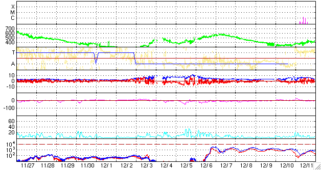 弱い中でも、南北成分が大きく南に振れ、-2nTの南向きが数時間続いたりしています。