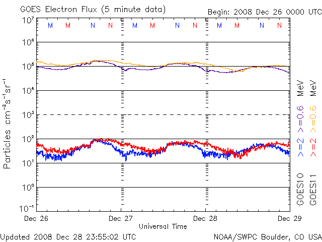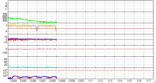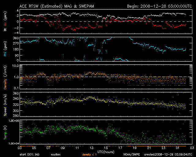 - 2008/12/24 07:05 高速太陽風が始まり、速度が500km/秒台に上昇しています。磁気圏もやや活動的です。