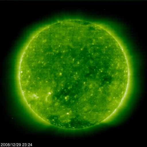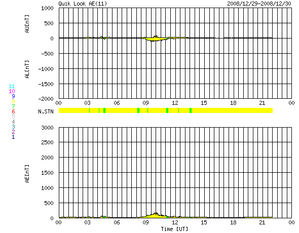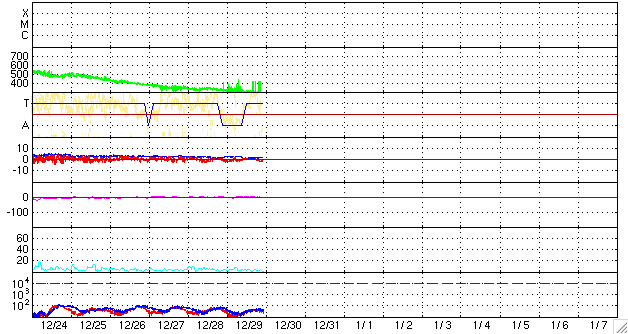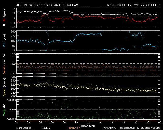2008/12/30 08:37 更新 太陽風はかなり低速になり、磁気圏も穏やかです。高速風の到来が近づいています。 担当 篠原 太陽風の速度は、300km/秒を割り、280km/秒近くにまで下がっています。 かなり遅い状態です。 磁場強度も1nTに弱まっていて、かなり穏やかです。 これから高速風がやって来ると予想していますが、 まだ、その気配は見えません。 磁気圏活動も、非常に静穏です。 27日周期の図を見てください。 前周期は、12月3日(日本時間では、4日頃)から、2つの山を持った高速風が始まりました。 その回帰が、今日のうちか、明日に入った頃に始まると思われます。 前周期の高速風は、最高速度は550km/秒程度でした。 今回もこの程度なのか、速度が高まるのか、注目しています。 また、前回の継続期間は、5日間程度でした。 元日を挟んで、オーロラ活動もある程度高まると思われます。 太陽は無黒点で、とても静かです。 SOHO EIT195による、太陽コロナの様子。30日8時半(世界時29日23時半)。 (c) SOHO (ESA & NASA) ![]() ACEが観測した太陽風の磁場(1番上の枠、白線は全体の強度、赤線は南北成分) および、太陽風の密度(3番目の橙線)、速度(4番目の黄線) (c) NOAA/SWPC ![]() リアルタイムAE指数 下段のAEグラフの値が高くなると、オーロラ活動が活発化しています。 (c) 京都大学, NICT ![]() シベリアで観測された3日間の磁場データ 右側の3分の1が、昨日のデータになります。グラフが上がったり下がったりすると、オーロラ活動が活発化しています。 (c) NICT ![]() 27日の太陽周期に合わせたデータプロット 太陽が同じ面を地球に向けていた27日前の変化から、今後を予想することができます。 (c) NICT