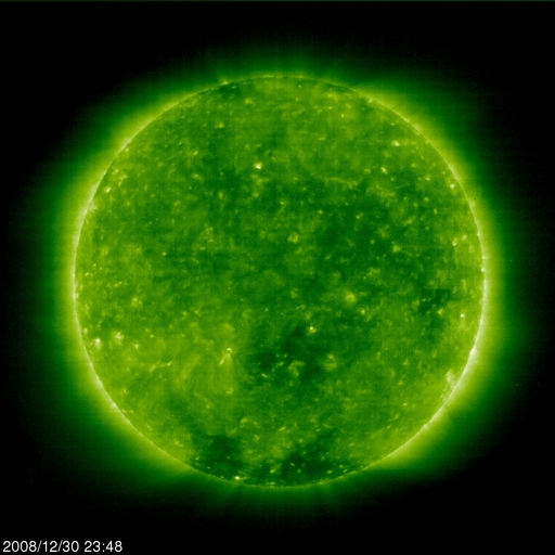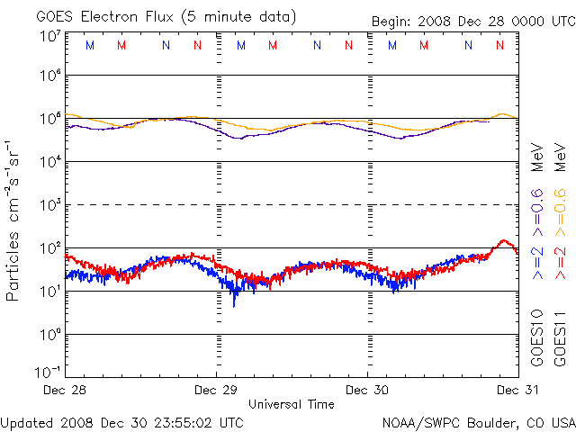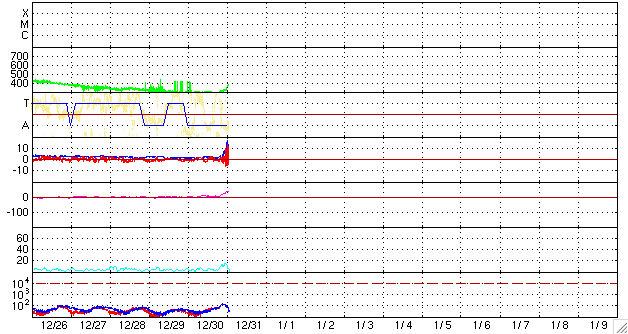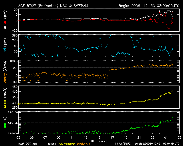 2008/12/31 11:04 更新 高速太陽風が始まりそうです。新年にかけて、オーロラ活動の活発化が期待できます。 担当 篠原 2008年から2009年にかけて、高速太陽風が始まりそうです。 昨夜、31日1時(世界時30日16時)頃から、太陽風のプラズマ密度が上昇し、 数時間ほど経過した31日6時(世界時30日21時)頃から、 太陽風の磁場強度と速度にも変化が始まりました。 現在、磁場強度は15nTに強まり、速度は400km/秒に上がっています。 速度としては、まだ、通常の状態に戻った程度ですが、 磁場強度がだいぶ強まっているので、引き続き上昇し、高速状態に移行すると思われます。 27日周期の図を見てください。 変化の始まりとしては、前周期とだいたい同じタイミングになりました。 これから5日くらい、高速風が続きそうです。 磁気圏活動は、まだ静かです。 しかし、太陽風の磁場強度が強まったことで、南向き磁場が強まる可能性があり、 この影響で、磁気圏活動も活発化すると思われます。 実際、ACEの図の最新(右端)の部分には、-15nTの強い南向きが観測されています。 ひとまず、この影響が今回の高速風による擾乱の第一弾となりそうです。 幸い、アラスカのライブカメラの配信が復活しています。 今日から明日にかけて、年越しのオーロラ観望がかなうかもしれません。 これから3日くらい、注目だと思います。 SOHO EIT195を見ると、コロナホールは太陽の西半球にすっぽりと入り、 東半球は、特に何も見えないようです。 今回の高速風通過後は、穏やかな状態が続きそうです。 太陽は今日も無黒点です。 結局、12月もほとんど無黒点の1ヶ月となりました。 太陽では、少しずつ新しい周期への動きが見えていますが、 その歩みは相変わらずとてもゆっくりです。 2008年も残りわずかとなりました。 みなさま、どうぞ良いお年をお迎えください。 SOHO EIT195による、太陽コロナの様子。31日9時(世界時31日0時)。 (c) SOHO (ESA & NASA) ![]() ACEが観測した太陽風の磁場(1番上の枠、白線は全体の強度、赤線は南北成分) および、太陽風の密度(3番目の橙線)、速度(4番目の黄線) (c) NOAA/SWPC ![]() リアルタイムAE指数 下段のAEグラフの値が高くなると、オーロラ活動が活発化しています。 (c) 京都大学, NICT ![]() シベリアで観測された3日間の磁場データ 右側の3分の1が、昨日のデータになります。グラフが上がったり下がったりすると、オーロラ活動が活発化しています。 (c) NICT ![]() 27日の太陽周期に合わせたデータプロット 太陽が同じ面を地球に向けていた27日前の変化から、今後を予想することができます。 (c) NICT