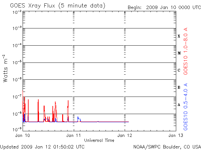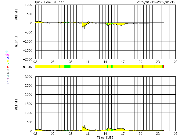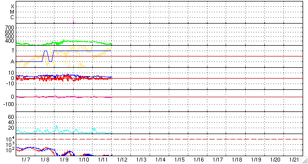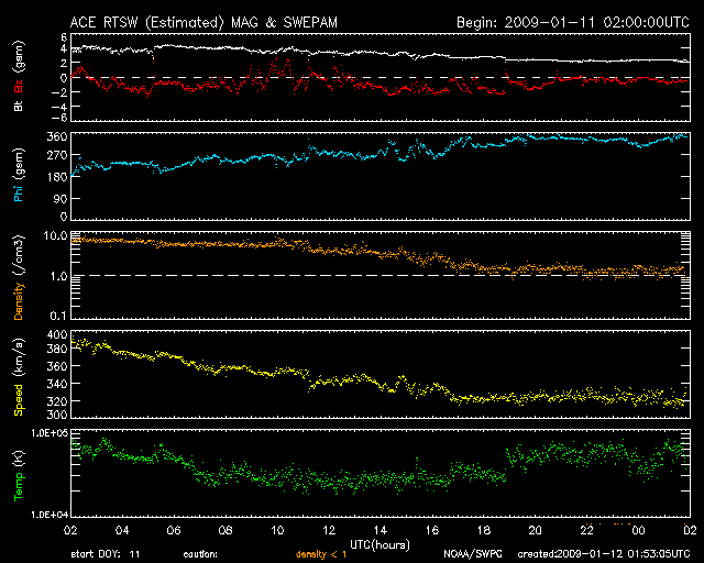 2009/ 1/12 10:53 更新 太陽風は320km/秒まで速度が下がり、かなり穏やかです。1010黒点群は、縮小しています。 担当 篠原 太陽風の速度は、更に低速になり、320km/秒まで下がっています。 磁場強度も、2nTへ弱まっています。 太陽風はとても穏やかです。 磁気圏では、AE指数で200nTほどの小さな変動が2〜3度発生しています。 これは、太陽風磁場が南寄りの傾向を保っていて、 弱いながらも-2nTほどの南向きを続けている影響でしょう。 しかし、現在の太陽風は、速度が大きく下がり、磁場強度もかなり弱まっています。 磁場の南寄り傾向が続いたとしても、 今後の磁気圏活動は一段弱いものとなるでしょう。 低速で穏やかな太陽風は、まだ1週間ほど続きます。 次の擾乱の始まりは、19日頃になると予想されます。 高速風の発生源のコロナホールが、太陽の東端に見える様になりました。 SOHO EIT195の左端を見てください。 横の方にあるため、まだはっきりとは見えませんが、 コロナホールの影が姿を現しています。 出現のタイミングとしては、前周期と変わりない様です。 もう2日ほどすると、広がりの比較もできるようになるでしょう。 太陽の北半球に現れている1010黒点群は、規模が縮小に向かっている様です。 昨日の写真と比較すると、黒点の数が減っています。 GOESのX線グラフも、Aクラスの活動もなくなって、 低いレベルの平坦なグラフになってしまいました。 黒点群は、このままゆっくりと消えて行くことになりそうです。 SOHO EIT195による、太陽コロナの様子。12日8時半(世界時11日23時半)。 (c) SOHO (ESA & NASA) ![]() SOHOによる太陽の可視光写真。黒点群は、次第に小さくなっています。12日7時半(世界時11日22時半) (c) SOHO (ESA & NASA) ![]() ACEが観測した太陽風の磁場(1番上の枠、白線は全体の強度、赤線は南北成分) および、太陽風の密度(3番目の橙線)、速度(4番目の黄線) (c) NOAA/SWPC ![]() リアルタイムAE指数 下段のAEグラフの値が高くなると、オーロラ活動が活発化しています。 (c) 京都大学, NICT ![]() シベリアで観測された3日間の磁場データ 右側の3分の1が、昨日のデータになります。グラフが上がったり下がったりすると、オーロラ活動が活発化しています。 (c) NICT ![]() 27日の太陽周期に合わせたデータプロット 太陽が同じ面を地球に向けていた27日前の変化から、今後を予想することができます。 (c) NICT