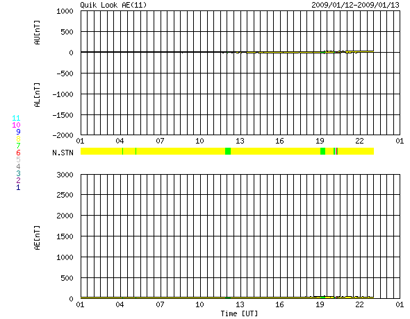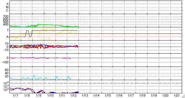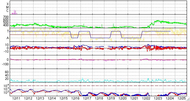 GOES衛星の太陽X線データ (c) NOAA/SWPC ![]() ACEが観測した太陽風の磁場(1番上の枠、白線は全体の強度、赤線は南北成分) および、太陽風の密度(3番目の橙線)、速度(4番目の黄線) (c) NOAA/SWPC ![]() リアルタイムAE指数 下段のAEグラフの値が高くなると、オーロラ活動が活発化しています。 (c) 京都大学, NICT ![]() シベリアで観測された3日間の磁場データ 右側の3分の1が、昨日のデータになります。グラフが上がったり下がったりすると、オーロラ活動が活発化しています。 (c) NICT ![]() 27日の太陽周期に合わせたデータプロット 太陽が同じ面を地球に向けていた27日前の変化から、今後を予想することができます。 (c) NICT