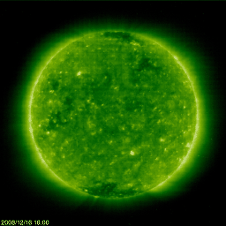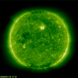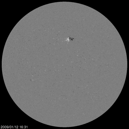 2009/ 1/13 09:06 更新 300km/秒台前半の低速の太陽風が続いています。1010黒点群は、間もなく消えそうです。 担当 篠原 1010黒点群は、どんどん小さくなっています。 今日の写真では、かろうじて点がひとつ確認できるだけです。 その一方、磁場写真を見ると、まだ立派に[ 白 黒 ]の分布が見えています。 白と黒が左右にすっぱり分かれている黒点群は、あまり活動的でないと考えられます。 実際、GOESのX線グラフには、ほとんど変化が見られません。 1010黒点群はこのまま消えてしまって、太陽は、無黒点に戻りそうです。 低速の太陽風が続いています。 昨日からの変化を見ると、速度は、320km/秒から一旦300km/秒に下がり、 今日に入った頃から再び330km/秒に上昇しています。 いずれも、とても小さな変化です。 太陽風磁場の南北成分は、南寄りの傾向が終わり、北寄りで推移しています。 このため、磁気圏は完全に静かになり、AE指数には全く変化が見られません。 この低速で穏やかな太陽風は、もう6日ほど続きます。 次の高速風の発生源であるコロナホールが、次第に姿を現して来ました。 SOHO EIT195の太陽写真で、現在(左)と、27日前(右)を比較して下さい。 すると、出現位置や、濃さ、広がりなどそれほど変わっていないようです。 細かく見ると、広がり方が丸まった形に変わっている様ですが、 たいした影響はないでしょう。 すると、前周期のグラフと同じ様な高速風が回帰して来るのではないかと思われます。 始まりは、1月19日頃からになり、 最高速度は550km/秒ほどで、高速状態は3日ほど続くと予想されます。 SOHOによる太陽の可視光写真。黒点群は、次第に小さくなっています。13日1時半(世界時12日16時半) (c) SOHO (ESA & NASA) ![]() SOHOによる太陽の磁場写真。中央部北寄りに見える磁場の強まりは、1010黒点群です。13日1時半(世界時12日16時半) (c) SOHO (ESA & NASA) ![]() SOHO衛星のEIT195カメラの映像 (c) SOHO (ESA & NASA)