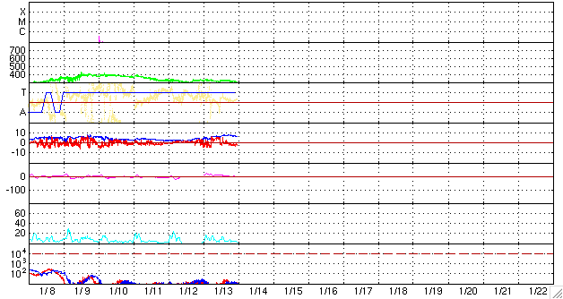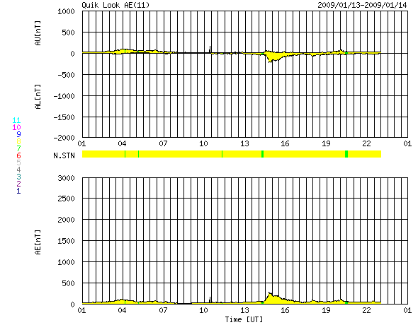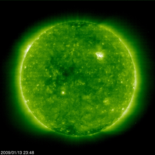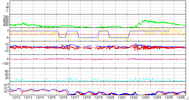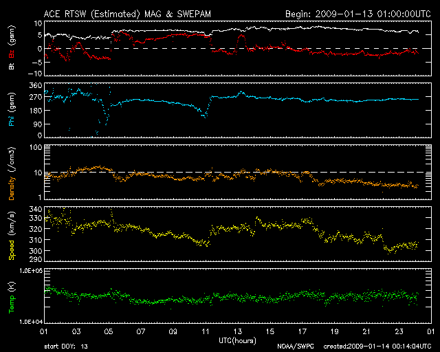 2009/ 1/14 09:06 更新 300km/秒台前半の遅い太陽風が続いています。太陽は無黒点に戻りました。 担当 篠原 速度の遅い太陽風が続いています。 ACE衛星の観測によると、太陽風の速度は、 330km/秒と300km/秒の低速域で、揺れながら変化しています。 一方、磁場強度は、5nTを超えて、一時的に8nT近くまで強まりました。 27日周期の図を見ると、前周期の12月17日頃にも同様の変化が見えています。 太陽風にそういう構造があるのかもしれません。 磁気圏はかなり穏やかです。 AE指数にはほとんど変化がなく、 図の後半に200nTほどの小さな山がひとつあるだけです。 この変化は、太陽風磁場が-2nTほどの南向きになっていたためでしょう。 穏やかな太陽風は、もう4〜5日ほど続きます。 SOHO EIT195では、コロナホールが太陽の中心線にかなり近づいています。 明日には中心線を越え、それから3〜4日で高速風の到来となるでしょう。 とはいえ、コロナホールの姿はかなり淡く、 前周期同様、高速風帯の規模は比較的弱いものに留まりそうです。 1010黒点群は見えなくなり、太陽は無黒点に戻った様です。 SOHO EIT195の北半球側の東端(左側の上寄り)に、明るく光っている領域が見えます。 小規模の活動領域がこれから上がって来ます。 ここに黒点群があるのかどうか、明日か明後日には見える様になるでしょう。 SOHO EIT195による、太陽コロナの様子。14日9時(世界時14日0時)。 (c) SOHO (ESA & NASA) ![]() SOHOによる太陽の可視光写真。黒点は見えなくなりました。14日1時半(世界時13日16時半) (c) SOHO (ESA & NASA) ![]() ACEが観測した太陽風の磁場(1番上の枠、白線は全体の強度、赤線は南北成分) および、太陽風の密度(3番目の橙線)、速度(4番目の黄線) (c) NOAA/SWPC ![]() リアルタイムAE指数 下段のAEグラフの値が高くなると、オーロラ活動が活発化しています。 (c) 京都大学, NICT ![]() シベリアで観測された3日間の磁場データ 右側の3分の1が、昨日のデータになります。グラフが上がったり下がったりすると、オーロラ活動が活発化しています。 (c) NICT ![]() 27日の太陽周期に合わせたデータプロット 太陽が同じ面を地球に向けていた27日前の変化から、今後を予想することができます。 (c) NICT