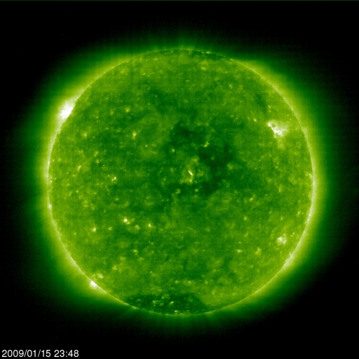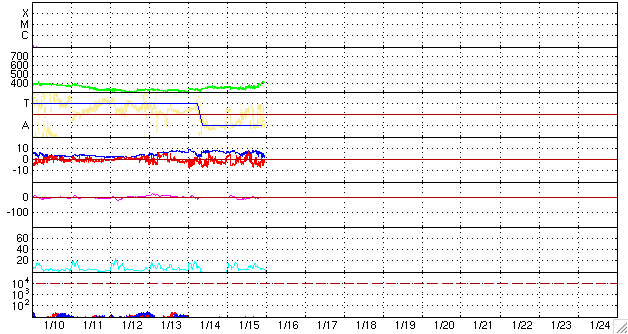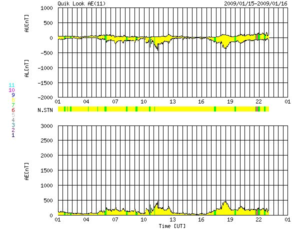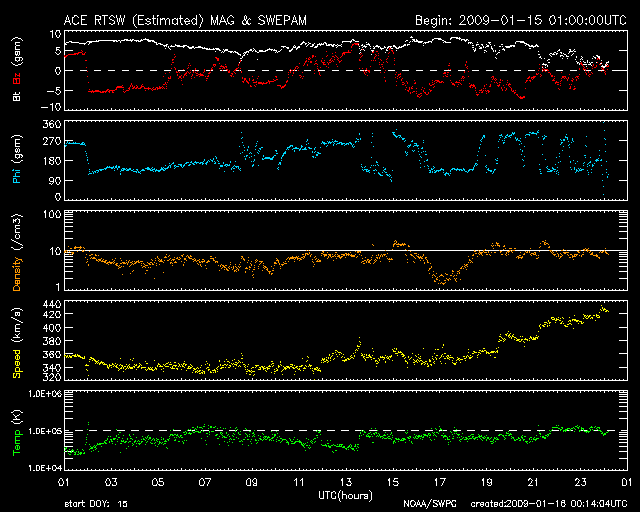 2009/ 1/16 09:06 更新 太陽風の速度が420km/秒に上がっています。磁気圏では、弱い活動が続いています。 担当 篠原 350km/秒前後を推移していた太陽風の速度(ACEの黄色線)が、 今朝に入って上昇しています。 現在、420km/秒に上がったところです。 大きく強まるということはないと思いますが、しばらく様子を見たいところです。 太陽風の磁場強度(白線)も、7nTあたりにやや強まったままで安定してます。 13日に始まったこの磁場の強まりも、 これで、3日間続いています(27日周期の図を見て下さい)。 SOHO EIT195を見ると、コロナホールは、 太陽の中心線を通過して、西半球側に進行しています。 地球へ影響が及び始める目安の位置までは、もう1〜2日ほどかかりそうです。 高速風の到来までは、もうしばらくかかるのではないかと思います。 太陽風磁場の南北成分(赤線)は、依然、南寄りの傾向(マイナス方向)を続けています。 このため、磁気圏では弱いながらも活動的な状態が続いていて、 200nTから500nTにかけての小規模オーロラ活動が、断続的に発生しています。 この傾向は、今日も続きそうです。 今後やって来る高速風ですが、27日周期の図によると、 18日か19日頃から始まると予想されます。 前周期の最高速度は、550km/秒ほど、高速状態は約3日間続きました。 太陽は無黒点のままです。 SOHO EIT195の東端(左端)で、 北半球の中緯度の明るい領域がこちら側へ回り込みつつあります。 規模はそれほど大きくないので、黒点があるかどうかは微妙です。 SOHO EIT195による、太陽コロナの様子。16日9時(世界時16日0時)。 (c) SOHO (ESA & NASA) ![]() SOHOによる太陽の可視光写真。黒点はありません。16日2時(世界時15日17時) (c) SOHO (ESA & NASA) ![]() ACEが観測した太陽風の磁場(1番上の枠、白線は全体の強度、赤線は南北成分) および、太陽風の密度(3番目の橙線)、速度(4番目の黄線) (c) NOAA/SWPC ![]() リアルタイムAE指数 下段のAEグラフの値が高くなると、オーロラ活動が活発化しています。 (c) 京都大学, NICT ![]() シベリアで観測された3日間の磁場データ 右側の3分の1が、昨日のデータになります。グラフが上がったり下がったりすると、オーロラ活動が活発化しています。 (c) NICT ![]() 27日の太陽周期に合わせたデータプロット 太陽が同じ面を地球に向けていた27日前の変化から、今後を予想することができます。 (c) NICT
