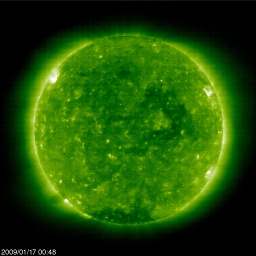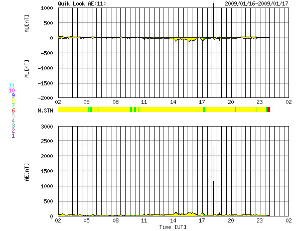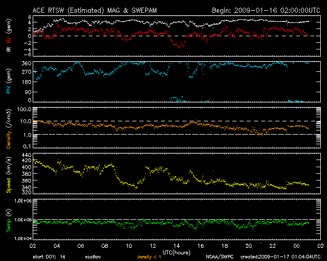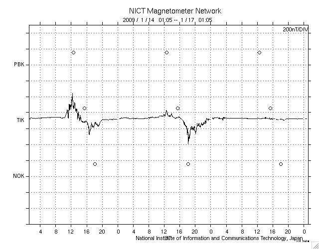 2009/ 1/17 10:04 更新 太陽風は340km/秒の低速になり、磁気圏も静穏です。明日以降、高速風領域に入るでしょう。 担当 篠原 太陽の東端に見えていた活動領域が、太陽のこちら側に回って来ました。 SOHO EIT195の太陽コロナ写真を見て下さい。 東端(左端)の北半球側に明るい領域が見えています。 SOHOの可視光写真によると、ここに黒点はありませんでした。 白く光る、白斑が見えています。 磁場の分布は、新しい第24期の極性でした。 GOESのX線データは静穏で、太陽活動は穏やかなままでしょう。 昨日、400km/秒台に上がっていた太陽風の速度は、 昨日のニュース以降、低下に向かい、現在、350km/秒へ下がっています。 低速の穏やかな太陽風に戻りました。 磁場強度は4nT。 南北成分は、0nTを中心に変化する様になりました。 磁場の南寄りの傾向がなくなったため、磁気圏へのエネルギーの流入が弱まり、 磁気圏活動はとても静かになっています。 AE指数のグラフには、全く変化が見られません。 今日いっぱいは、穏やかな太陽風が続くでしょう。 明日か明後日くらいから、高速太陽風が始まると予想されます。 SOHO EIT195では、コロナホールが西半球(左側)の半分まで進行しており、 高速風の到来が近いことを告げています。 高速風の始まりには、太陽風磁場が強まって、 強い南向き磁場をもたらす可能性が高まります。 このタイミングで、強いオーロラ活動が発生することが多いので、 オーロラ観望を狙っている方は、これからのACEデータに注目して下さい。 27日周期の図の前周期のグラフ、12月22, 23日頃のIMF Bz, Btに、 その様子が見えています。 この変化の回帰の頃がチャンスです。 SOHO EIT195による、太陽コロナの様子。17日9時(世界時17日0時)。 (c) SOHO (ESA & NASA) ![]() SOHOによる太陽の可視光写真。活動領域に白斑が見えます。17日7時半(世界時16日22時半) (c) SOHO (ESA & NASA) ![]() GOES衛星の太陽X線データ (c) NOAA/SWPC ![]() ACEが観測した太陽風の磁場(1番上の枠、白線は全体の強度、赤線は南北成分) および、太陽風の密度(3番目の橙線)、速度(4番目の黄線) (c) NOAA/SWPC ![]() リアルタイムAE指数 下段のAEグラフの値が高くなると、オーロラ活動が活発化しています。 (c) 京都大学, NICT ![]() シベリアで観測された3日間の磁場データ 右側の3分の1が、昨日のデータになります。グラフが上がったり下がったりすると、オーロラ活動が活発化しています。 (c) NICT ![]() 27日の太陽周期に合わせたデータプロット 太陽が同じ面を地球に向けていた27日前の変化から、今後を予想することができます。 (c) NICT